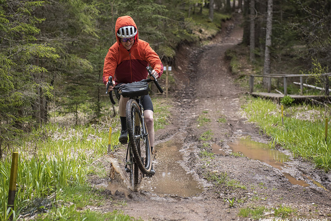 Tijdens het eten moeten de jasje moeten aan, want de lucht is inmiddels helemaal dichtgetrokken. En we houden ze aan, want na de Krabes Alm gaat de route alleen nog maar omlaag. Dat wil niet zeggen dat het verder kinderspel is. Het met kleine rivierkeitjes bestrate pad waarover de gps ons naar beneden dirigeert is best lastig. Niet eens omdat het zo steil is, maar met name vanwege de gladheid van die keitjes. En als er op een gegeven geen bestrating meer is, maar alleen maar een dikke laag blubber, voelt het eerder als veldrijden dan als gravelbiken.