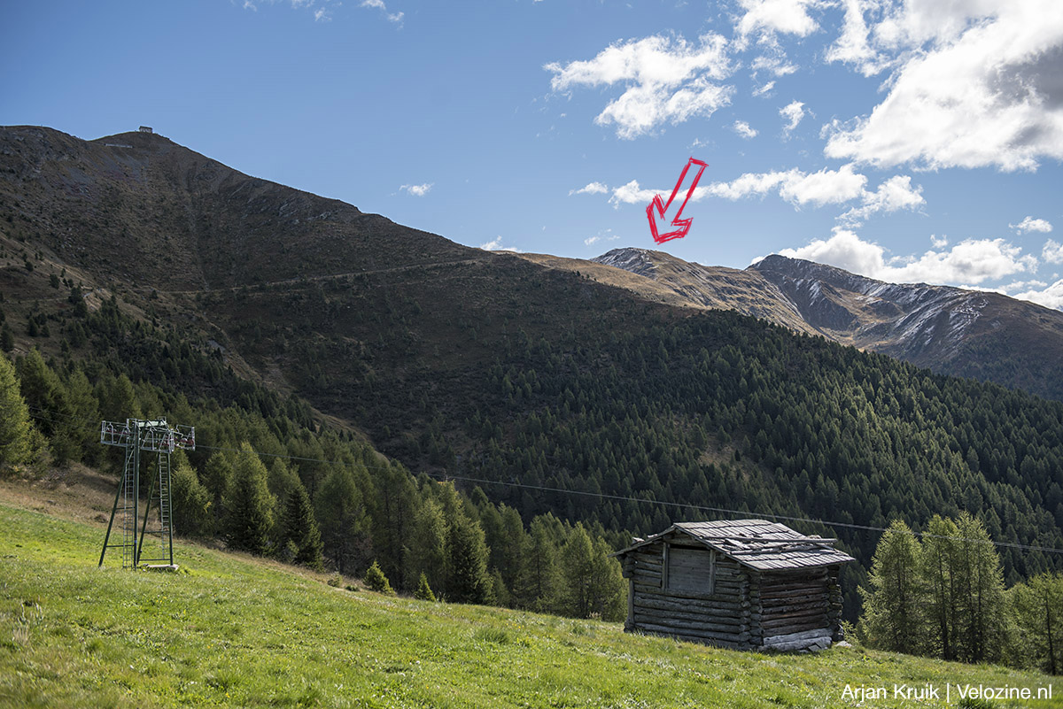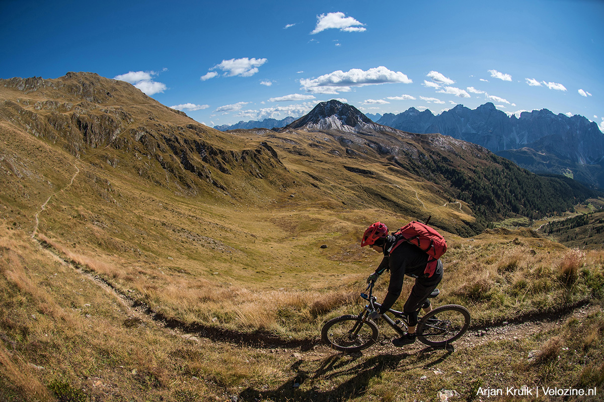 Even voorbij de Sillianer Hütte passeren we nog wat oude, vervallen kazematten en dan is het gedaan met de militärstraße en gaat de route verder over een smalle trail Of beter: trails, want de kam ligt vol met paden. Gelukkig weet Arno precies de weg. Niet zo gek, hij vertelt dat dit de vijftiende keer is dat hij dit jaar de Demut-passage rijdt: “Vaak op een e-mountainbike, veel mountainbikers die hier tegenwoordig komen hebben een motortje onder hun bike hangen. Maar op een biobike is het natuurlijk het leukst!”