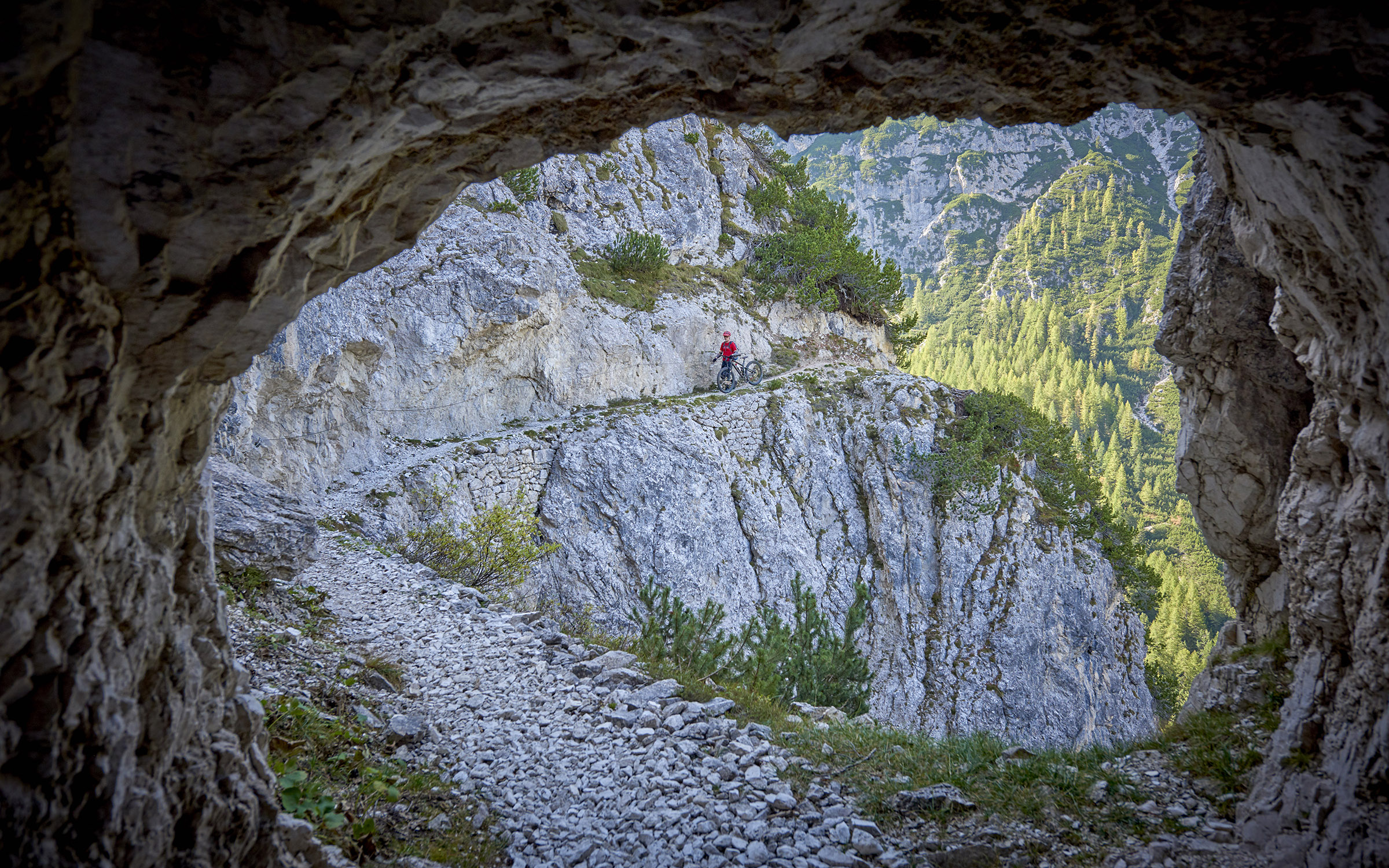 Als je de Dürrensteinhütte bereikt hebt, kun je vanaf daar naar beneden om het rondje af te maken. “Dat kan op twee manieren”, vertelt Michael een beetje geheimzinnig. Hij laat het zien op de kaart: “We kunnen de officiële route volgen. Die loopt in het verlengde van schotterstraße waarover we omhoog gekomen zijn naar het noorden toe, met als je wilt zo nu en dan een stukje singletrack. Maar er is ook een veel uitdagender variant, een oude militärsteig die via de oostelijke flank van de Dürenstein door het Helltal naar het Höhlensteintal loopt. Supermooi, maar ook nogal uitdagend. Laat ik het zo zeggen: je moet geen hoogtevrees hebben…”