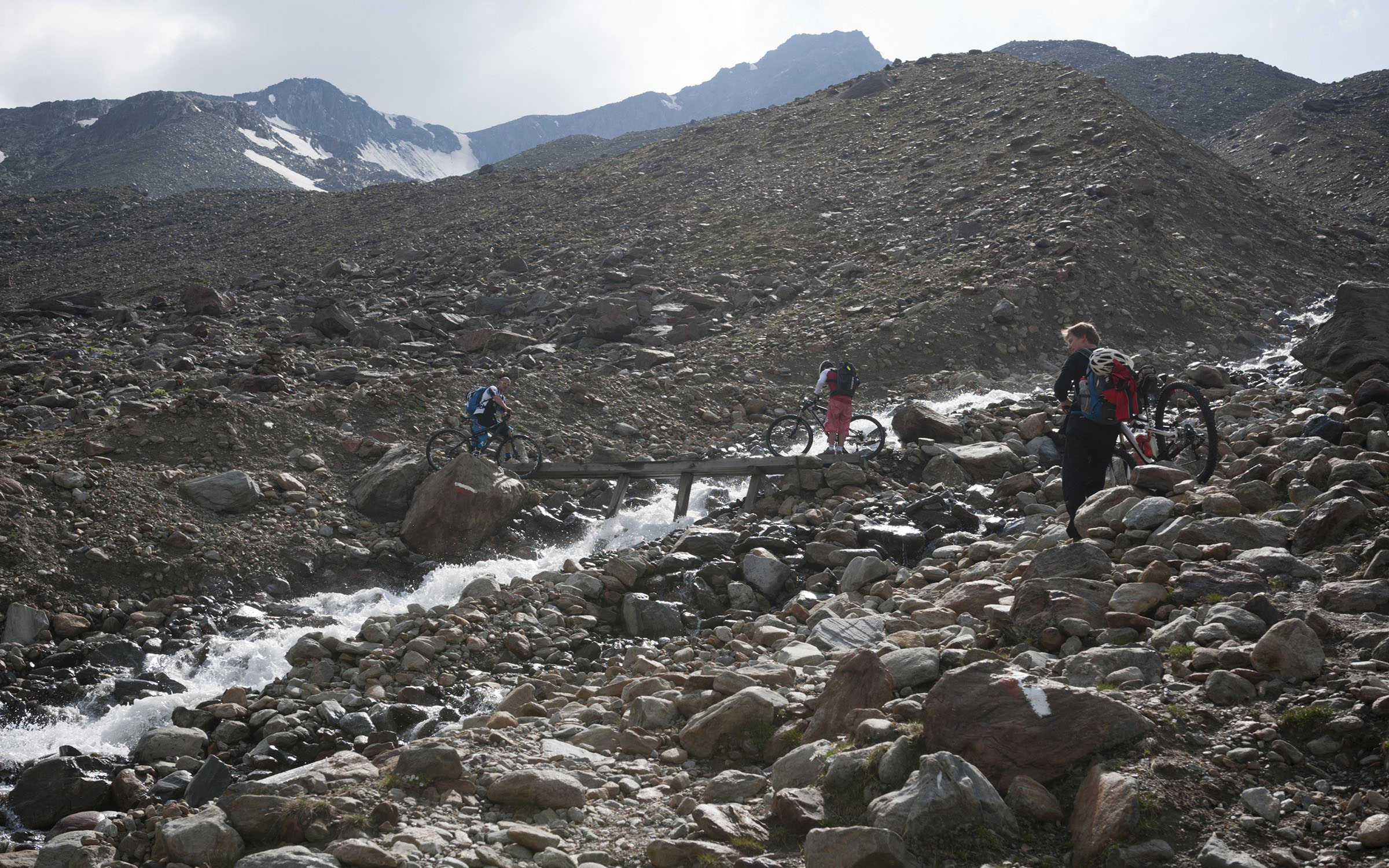 Vanaf de op 2.501 meter hoogte gelegen Martin Busch Hütte is het nog maar 500 hoogtemeters naar de Similaunhütte. In theorie zijn we dus op tweederde van de trip. Hoe dat in de praktijk is, moet nog blijken. Want hoeveel hoogtemeters kunnen we fietsen en hoeveel moeten we lopen? De eerste meters beginnen goed. Gewoon fietsbaar. Maar dan maken we een fout. Bij een Y-splitsing volgen we de signalering; we gaan rechts de berg op. Terwijl het pad dat links langs de beek loopt er toch echt veel toegankelijker uitziet. Maar ja, de officiële bordjes wijzen naar boven…