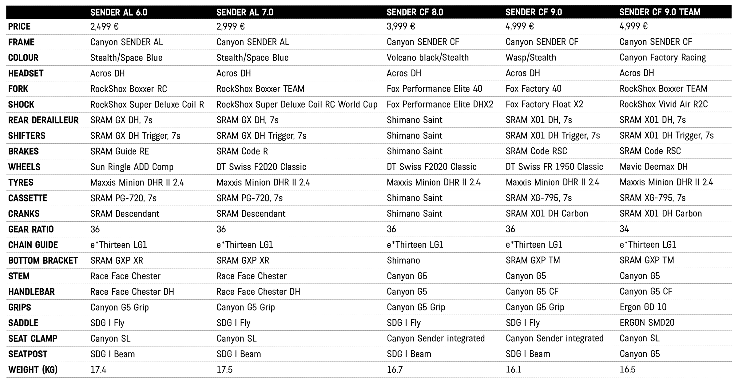 Iets zegt ons dat we komend seizoen massa’s jonge gastjes gaan zien op deze fietsen. De Sender AL 6.0 is er namelijk al voor €2.499! Dan hangen er relatief eenvoudige RockShox componenten aan, plus een SRAM GX DH groep. Iets chiquer is de Sender Al 7.0 voor €2.999. Het heeft misschien niet de uitstraling van carbon, maar wat persoonlijke verings-tuning bij een specialist kan je van deze bikes onopvallende maar gemene wapens maken. Misschien is ook dat stiekem nog wel een betere optie dan doorsparen voor een Sender carbon…