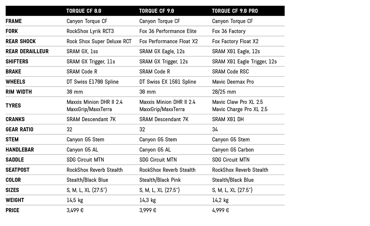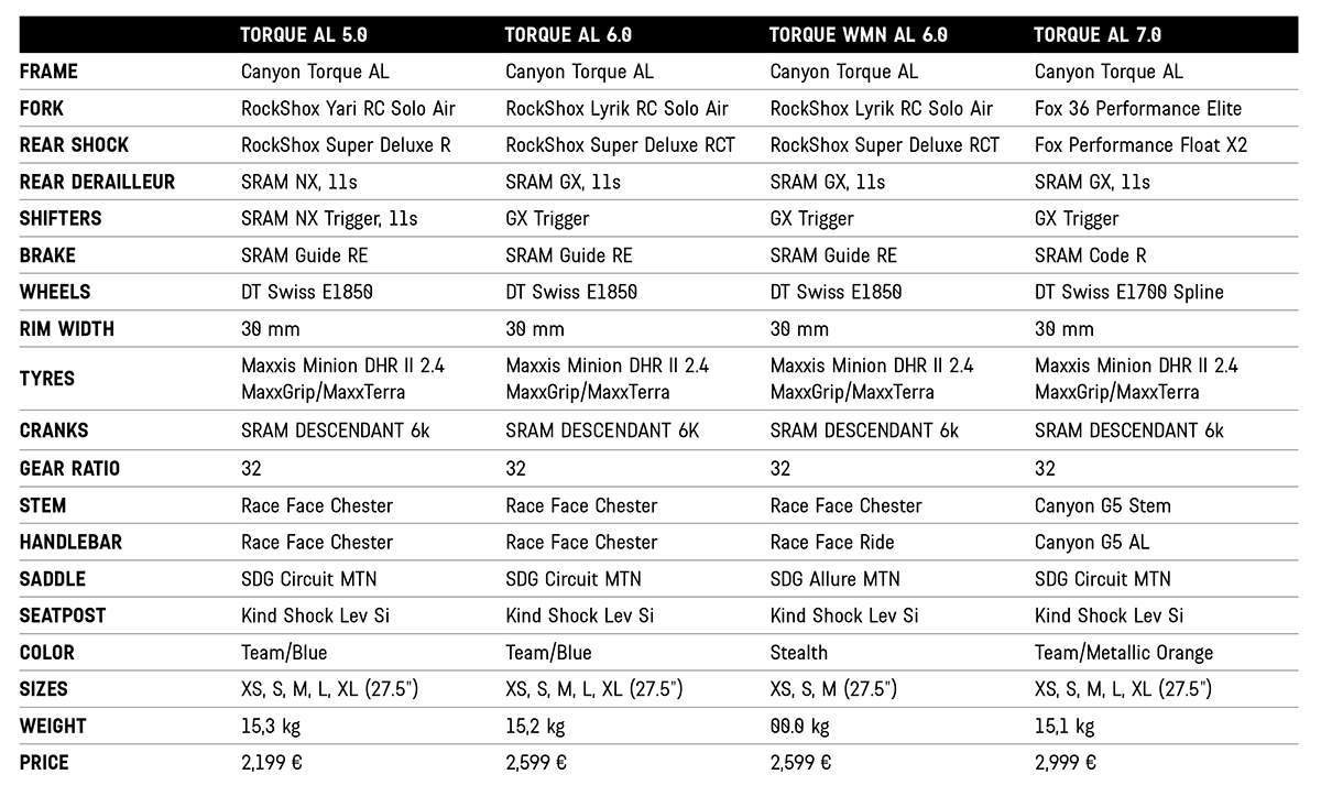 De Torque komt in 7 verschillende unisex en dames (WMN) varianten, van de aluminium AL 5.0 met een basis RockShox / SRAM NX1 afmontage voor €2.199, tot de carbon CF 9.0 PRO met Fox Factory veerwerk en een XO1 Eagle groep voor €4.999. Let wel, de carbon modellen hebben altijd een aluminium achterbrug. Omdat het beter bestand is tegen het ruige gebruik – aldus Canyon – maar evengoed de kosten binnen de perken houdt.