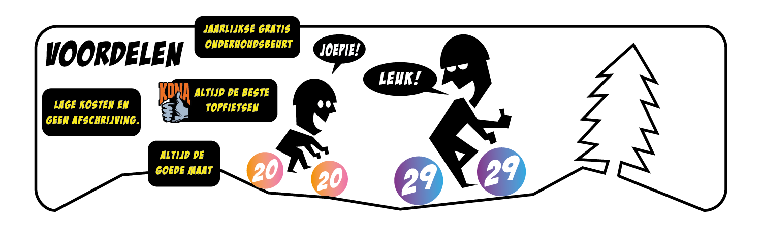 De bikepool van 20-24.CC bestaat uit een arsenaal echte mountainbikes met 20”, 24” en 27,5” wielen van Kona. Zodra de mountainbike te klein wordt, wordt er simpelweg ‘doorgepoold’ naar een grotere fiets uit de collectie. De oude bike gaat terug de pool in en wordt telkens 100% in orde gebracht voor de volgende aspirant shredder. Je betaalt een huur per maand; van €20,00 voor een Honzo 20” tot €27,50 voor een Cinder Cone met 27,5” wielen. Jaarlijks wordt een gratis onderhoudsbeurt uitgevoerd om er voor de zorgen dat de fietsen tip-top zijn én blijven. Daarvoor werken ze samen met diverse partners in Nederland en Vlaanderen die ook service verlenen bij schade, reparatie en onderhoud.