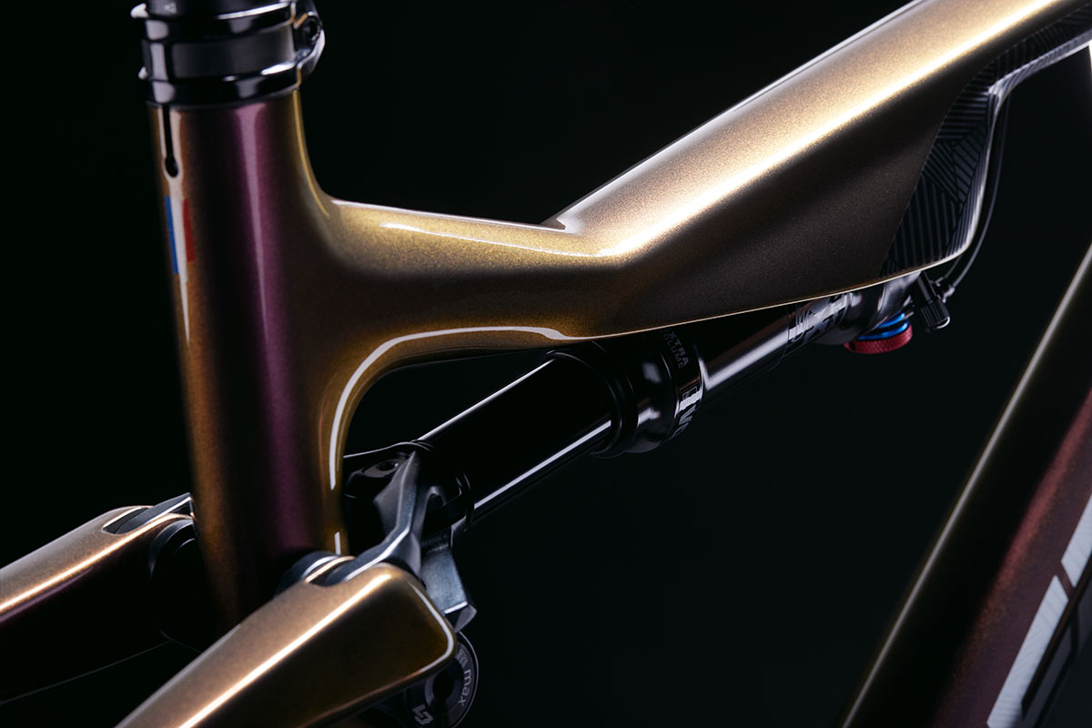 Maar een geoptimaliseerde carbon-constructie is maar één deel van de vermageringskuur. De meest zichtbare verandering waarmee gewicht is bespaard bij de 2022-versie van de XR/XRM is de achtervering. Niet alleen ontbreekt nu de zo kenmerkende ‘kooi’ rond de achterdemper, maar óók het gelagerde scharnierpunt bij de achternaaf ontbreekt. En daarmee schaart Lapierre zich dus met de nieuwe XR/XRM in het lijstje met onder meer de Cannondale Scalpel, Santa Cruz Blur, Merida Ninety-Six, Scott Spark en Giant Anthem, waarbij ook beweging in het materiaal van de staande en/of liggende achtervork gebruikt wordt om een scharnierpunt te vervangen; flex-stays dus.
