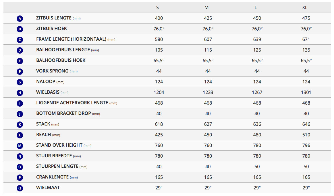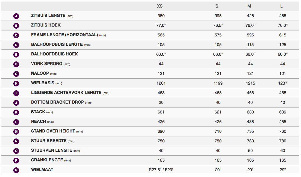 De Stance E+ is beschikbaar in vier framematen, waarbij ze allemaal voorzien zijn van 29 inch wielen. Opvallend genoeg is de balhoofdsbuis met 65,5 graden net zo flauw als die op de dikkere Trance X E+ in de flauwste setting. En waarbij je bij de Trance X E+ de bike wat meer rechtop kunt zetten via een flipchip kan dat bij de Stance E+ niet. Zodoende is de zitbuishoek dus ook altijd 76 graden. Qua reach en wielbasis geeft Giant de Stance E+ courante waarden. Niets overdreven lang, al is dankzij het FlexPoint veersysteem de achtervork wél korter dan die bij de met Maestro-vering uitgevoerde Trance X E+. Dit komt de wendbaarheid van de Stance E+ dus zeker ten goede.