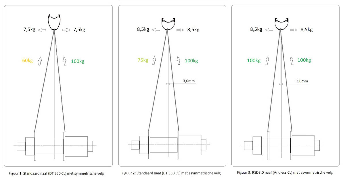 De oplossing ligt volgens Andless dus in het helemaal gelijk trekken van de spanning in alle spaken van een wiel. Dan is de draagkracht van het wiel het hoogst, omdat geen enkele spaak eerder ontspant dan de rest. Sterker nog: op papier is de draagkracht van een volledig gelijk gespannen wiel tot 25% hoger. Zie het als elimineren van de zwakste schakel – het kernpunt van Rim Specific Design, zijnde: de slapste spaken. Dit alles is alleen mogelijk met een moderne, stijve en vooral asymmetrische velg.