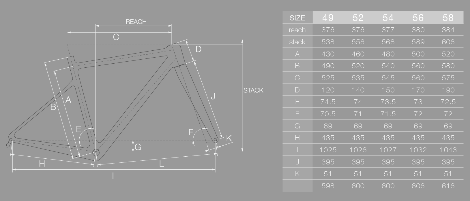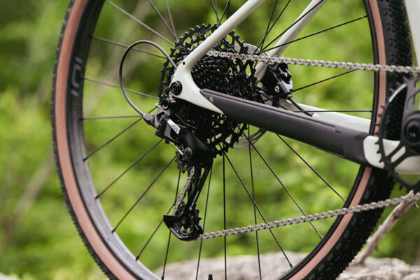 De brede inzetbaarheid, of in elk geval de intentie daartoe, blijkt ook uit de geometrie. De trapashoogte is dusdanig dat je niet meteen met je cranks aan de grond zit wanneer je 28 mm gladde bandjes monteert. De Onyx GX van Apex Bikes is vervolgens met ruimte voor banden tot 50 mm breedte dus ook geschikt voor serieus offroad gestuiter. Let wel; we hebben het hier over 700c wielen met dergelijk dik rubber. Dus niet een kleiner (27,5” / 650b) wiel waardoor er breed rubber in het frame past, zoals veel andere aanbieders het doen. Het compromis is echter dat de trapas relatief hoog staat wanneer je met veel volume op pad gaat. In vergelijking met andere gravelbikes die meer ontworpen zijn voor volumineuze banden, zou de Onyx GX zodoende iets nerveuzer over kunnen komen. Daar staat dan weer tegenover dat de achtervorklengte met 435 mm relatief lang is, wat juist weer wat stabiliteit aan de fiets geeft.