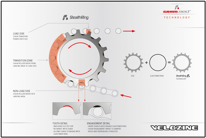 SRAM gaat er prat op de groep een stuk vlotter en vooral stiller schakelt. Dit is grotendeels te danken aan de cassette. Deze 10 speed cassette is voor een groot deel uit 1 stuk gemaakt volgens het Powerdome principe. Daarnaast hebben de engineers een extra uitsparing voorzien tussen de tanden en worden er elastomeren ‘Stealth’ ringen geplaatst tussen de afzonderlijke kransjes. Dit heeft als effect dat de kettingrol niet ‘hard’ tegen het kransje aanslaat bij het ingrijpen. Leuk voor op de weg, off-road lijkt me dit naast niet strikt ‘nodig’ vooral een belemmering voor de afvoer van vuil. De RED groep blijft echter gewoon compatibel met de traditionele cassettes.