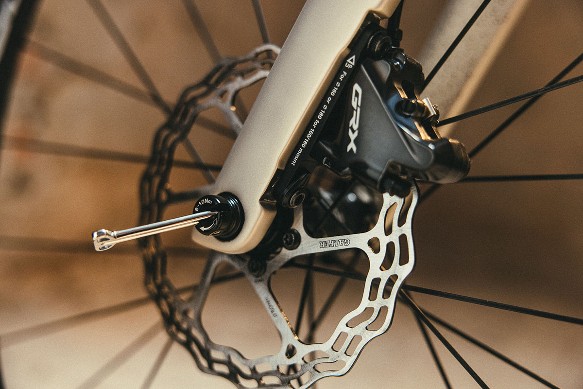 Voor het ontwerp van het GravelX-frame hebben de BH-ontwikkelaars duidelijk inspiratie gehaald bij de Ultralight-wegracer van het merk. Scherpe lijnen in combinatie met enkele aerodynamische details voeren de boventoon. Zo is nu bijvoorbeeld ook de zadelpenklem weggewerkt in het frame. De zadelpen is overigens aan de achterzijde afgeplat. Of dat dit frame – al dan niet met een adapter – uit de voeten kan, is ons (nog) niet bekend.