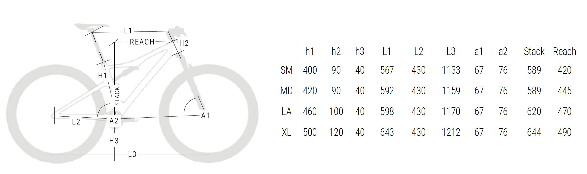 Ten opzichte van de vorige Lynx Race LT (met 120 millimeter veerweg) heeft de 2024 versie dezelfde stuurhoek van 67 graden. De reach is echter wél wat vergroot en BH heeft daarom ook de zitbuis meer rechtop gezet. Die staat nu met 76 graden een volle graad rechter. Onderstaande tabel toont de geometrie van de Lynx Race LT. Voor de versie met 100 millimeter veerweg zijn de hoeken 0,5 graad steiler.