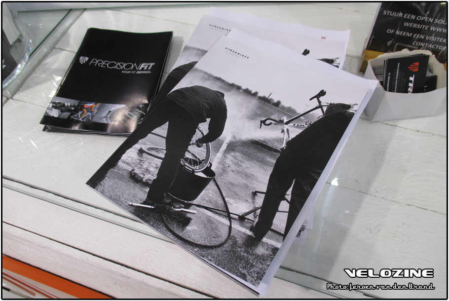 Toch waren er grote merken die met hun grote stands en uitgebreide assortiment bij mij een snaar wisten te raken. Bij Trek stond de fiets van Jens “Shut Up Legs” Voigt pontificaal vooraan. Maar wat mij het meest aantrok bij Trek was toch wel de voorkant van de brochure en een poster die op de balie lag. Op de voorkant van de brochure geen mooie fiets, maar gewoon twee mannen die een fiets aan het schoonmaken zijn. De fietspassie, het ambacht, het plezier van onze sport wordt prominent op de voorkant van hun brochure gezet. Het gaat niet meer of nog alleen om de fiets, maar om het beleven van het fietsen.