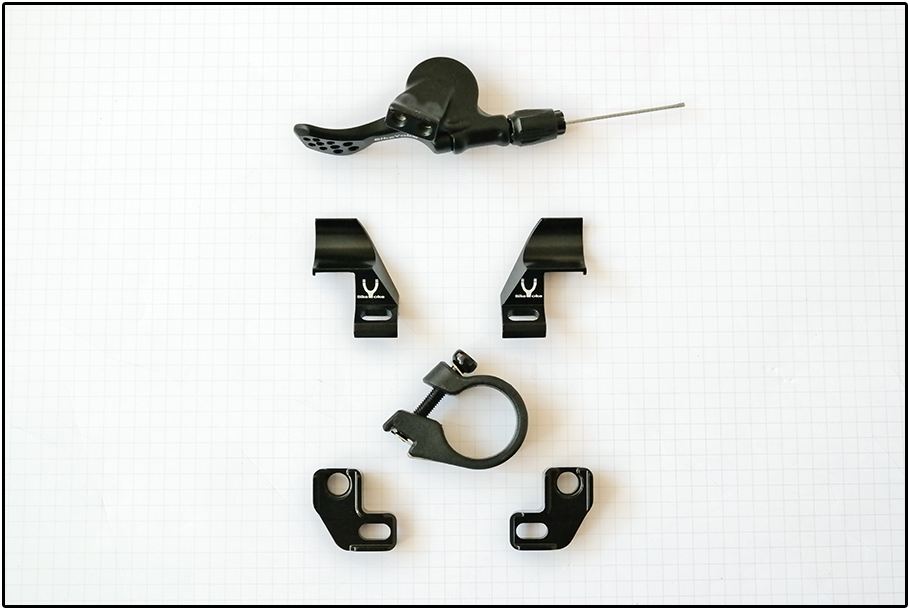 BikeYoke’s leverde al adapters waarmee je hun Triggy remote rechtstreeks aan remgrepen van Shimano, Magura, SRAM en Formula kan monteren. Nu komt daar een adaptertje bij waarmee je je SRAM shifter direct aan je rechter Shimano remgreep kan monteren. Niet levensveranderend, niet uniek, wel handig.