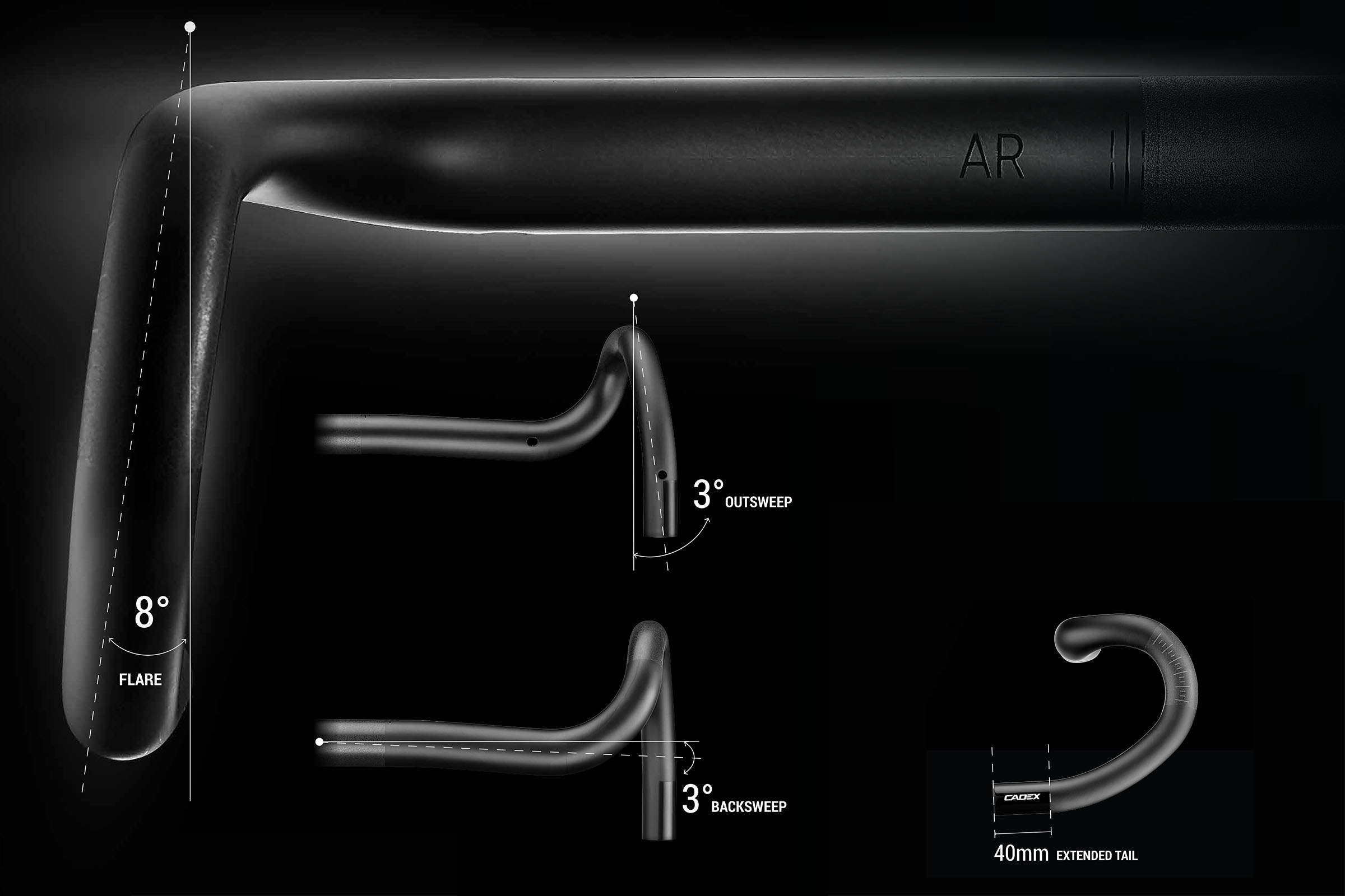 Het Cadex AR carbon gravelstuur is relatief compact, met een drop van 115 mm en reach van 70 mm. Voor een optimale ergonomie heeft het bovenste gedeelte een backsweep van 3º. Zo’n achterwaartse buiging zagen we eerder ook al bij de Giant Revolt Advanced 2 gravelbike die we vorig jaar testten. De zijkanten van dit Cadex AR stuur zijn 8º ‘onderuit’ gekanteld (flare) en de uiteinden lopen 3º naar buiten. Die uiteinden zijn overigens 40 mm langer dan die van de Race Handlebar en zorgen voor extra stabiliteit en controle bij afdalingen wanneer je onder in het stuur hangt, aldus Cadex in het persbericht. Tot slot is het stuur Shimano Di2 compatibel, zodat je de bar-end module EW-RS910 in het stuur kwijt kunt.