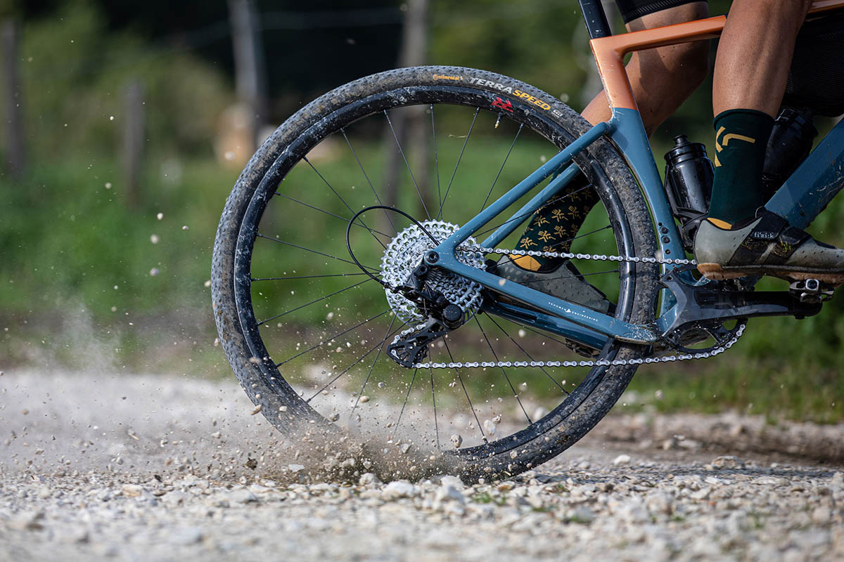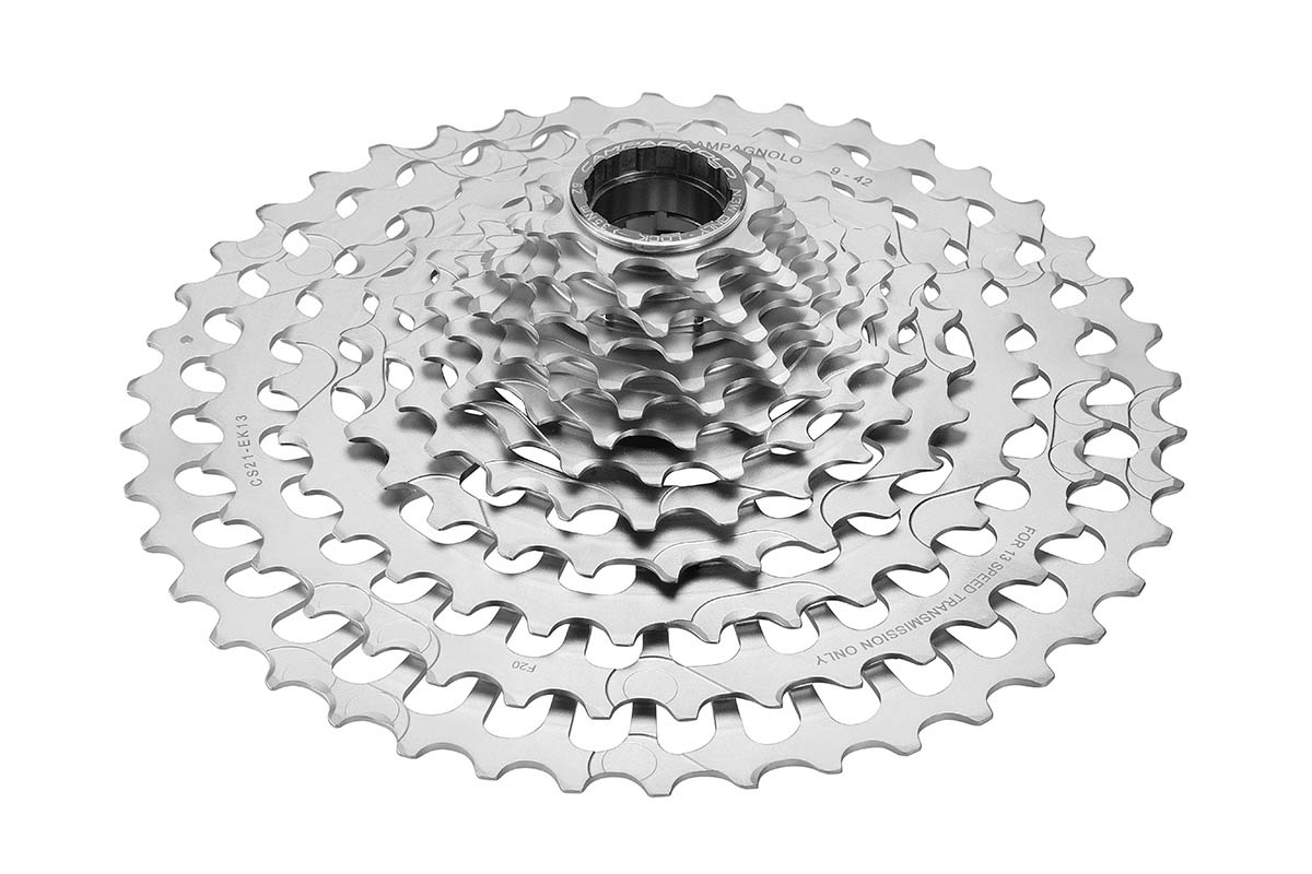 Goed, terug naar Ekar. Omwille van de breedte van het gravel-genre, biedt Campagnolo 3 cassettes: 9-36t, 10-44t en 9-42t met dus bereiken van respectievelijk 400%, 440% en 467%. Dat is zelfs interessant voor mountainbikers! Maar voor we afdwalen: hoewel het gekend is dat kleinere kransen minder efficiënt zijn, kiest Campagnolo bewust er toch voor om zodoende een groot bereik te creëren zonder op extreem grote en dus zwaardere cassettes uit te komen.