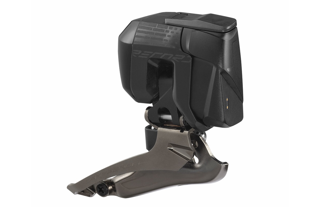 De voorderailleur in de 2×13-opstellingen (Road én All Road) is technisch identiek aan die van Super Record. Geschikt voor kettingbladcombinaties van 29 tot 55 tanden, concreet alle zeven 2x-combinaties die Campagnolo binnen het platform aanbiedt. Veel meer details geeft Campagnolo niet vrij over de Record-voorderailleur, en dat zegt op zichzelf óók iets: het verschil met de Super Record-pendant is hier inderdaad betrekkelijk klein. De voorderailleur draait op z’n eigen, specifieke afneembare en oplaadbare batterij en is niet uitwisselbaar met die van de achterderailleur.