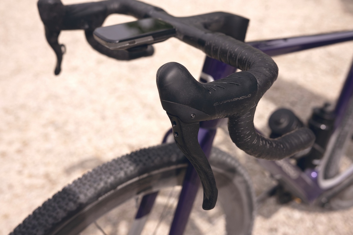 De Ergopower-grepen van de Record-groep zijn in hoofdlijnen identiek aan die van Super Record. Ze hebben dus dezelfde vorm en ergonomie, en uiteraard ook dezelfde knoppen. Elke greep heeft z’n eigen CR2032-knoopcel en de extra mode button en smart button, om extra functionaliteiten aan te koppelen — denk aan scrollen door de schermen van je fietscomputer. Ook qua hydrauliek zijn de grepen identiek aan de Super Record-grepen. Het enige verschil is de afwerking. De Record-grepen hebben laser-gegraveerde logo’s in plaats van gespoten bij Super Record, plus nieuwe rubberen kappen met een matte/glanzende contrastafwerking.