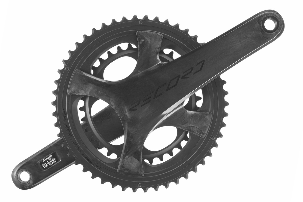 Het structurele verschil tussen Record en Super Record cranks zit op twee plekken. Eén: de trapas. Bij Super Record is die in titanium uitgevoerd, bij Record in roestvrij staal. Campa heeft via een uitgebreide stress-analyse de wanddiktes geoptimaliseerd om de gewichtstoename te beperken. Twee: de crankarmen. Bij Super Record wordt het minder belaste deel van de crankarm hol uitgevoerd. Bij Record zijn de carbon crankarmen op die plek gevuld met een technopolymeer met lage dichtheid.