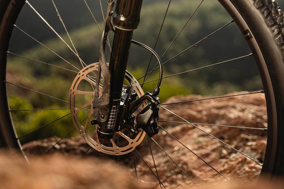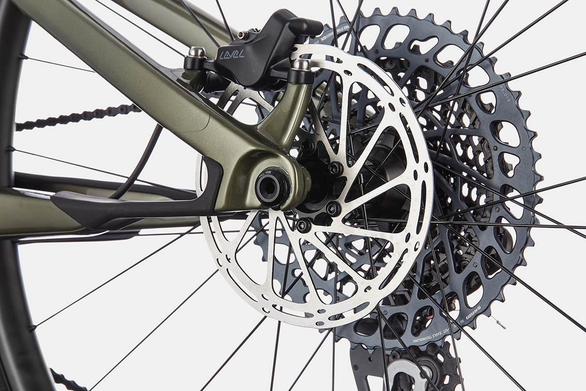 De quick-release (ja!) schijfremmontage die Cannondale op alle Lefty Ocho’s voert voor een gemakkelijke wielwissel, is iets herzien. Bij deze 120-Lefty kun je 180 tot en met 203 mm remschijven monteren. De lockout is naar keuze te bedienen op de vorkkroon of via een hendel op het stuur.