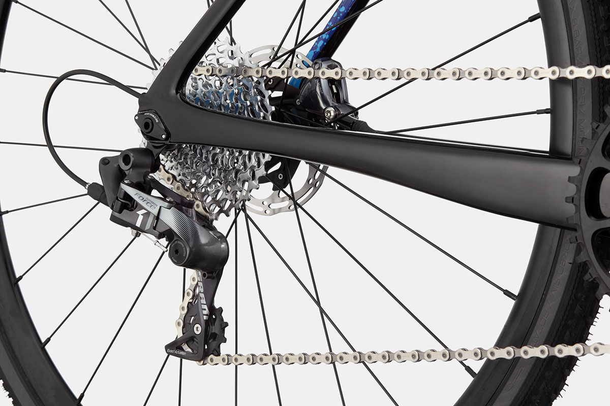 Net als met de voorganger, de SuperX en SuperX SE, slaat Cannondale met de SuperSix Evo CX en SuperSix Evo SE twee vliegen in één klap. Ze combineren bij dit nieuwe frame de cross-genen van de SuperX met de ontwerptaal én geometrie van de lichtgewicht SuperSix Evo-aero-racefietsen en geven hem volop ruimte voor brede banden. Het resultaat is een carbon frame dat voor – de door de UCI voor crosswedstrijden gemaximaliseerde – 33 mm banden zeer ruime moddervrijheid heeft, maar ook uit de voeten kan met banden tot 45 mm breedte. Naast de Topstone Carbon – die met zijn ‘softtail’ achtervering bedoeld is voor het ruigere gravel-gebeuren, is de SuperSix Evo SE dus als gravelracer vooral toegespitst op snelheid, waarbij framestijfheid en (blijkbaar off road ook) ‘aero’ meer van belang zijn. Niet iedereen gebruikt zijn gravelbike als bikepacker, namelijk.