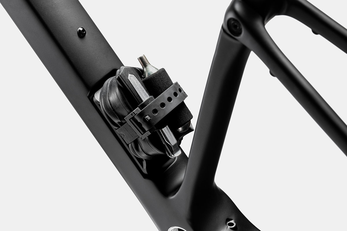 Verder vind je op de onderbuis van de 2022-Topstone Carbon gravelbike Cannondale’s nieuwe ‘StrapRack’. Onder het riempje kun je reservemateriaal kwijt. Dit is ook de plek waar Cannondale zijn SmartSense-module monteert. Dit is een intelligent systeem dat communiceert met adaptieve verlichting en een optionele Garmin Varia-radar die berijder feedback geeft over achteropkomend verkeer. Bij verschillende modellen (zie verderop in dit artikel) levert Cannondale de SmartSense-module in plaats van de StrapRack. Een combinatie van beide kan helaas niet.