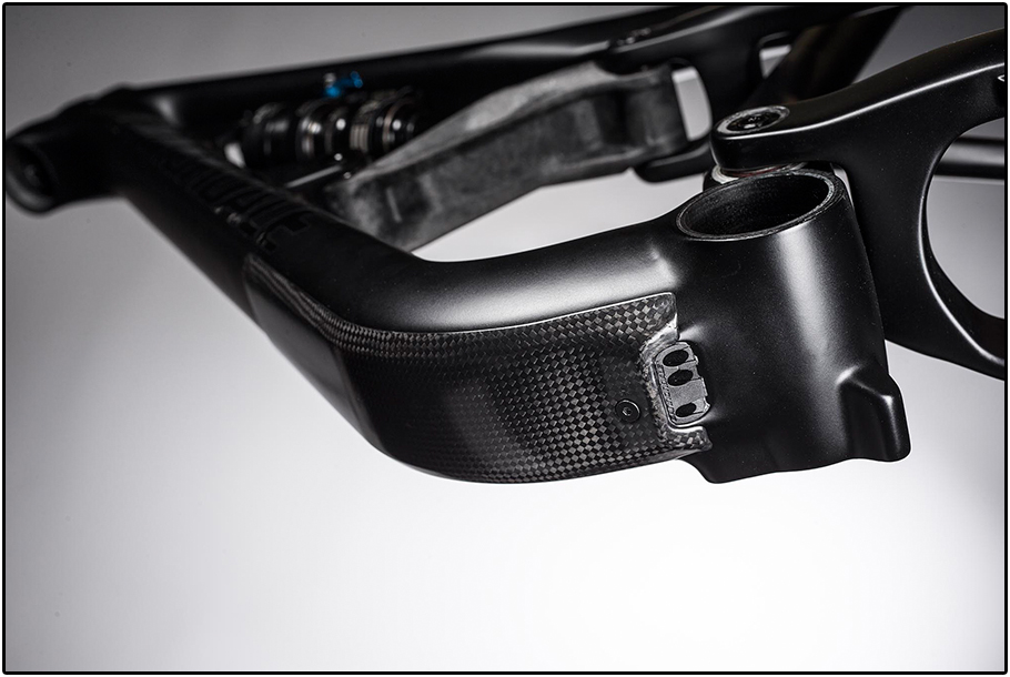 Met de wijzing van het type demper is ook de layout van het veersysteem veranderd: De demper zit nu op de plek waar voorheen een bidon kon worden gemonteerd. Nu is de ruimte onder de hevel dusdanig dat daar nu nét een bidon past. Al zegt iets in ons dat je waarschijnlijk een bidonhouder nodig hebt waar je de bidon zijdelings uit kunt nemen… Belangrijker nog: de vorige configuratie bouwde nogal breed en dat was niet naar ieders smaak. Nu is de hevel mooi smal en valt geheel binnen de breedte van de framebuizen!