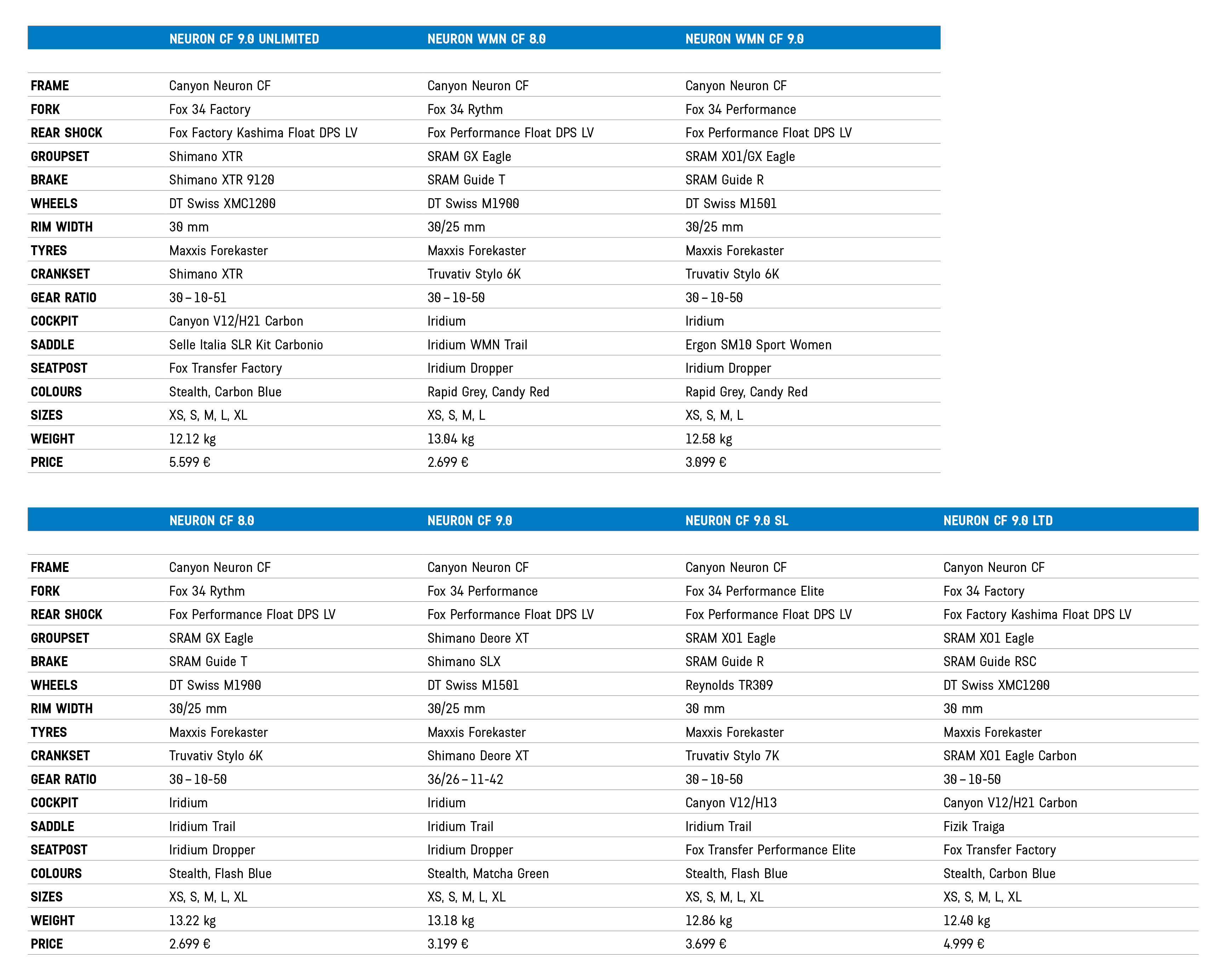Hoewel de aluminium Neuron nog even ongewijzigd parallel in het programma blijft, wordt de Neuron-serie dus uitgebreid met een volledig nieuw carbon frame. Ook deze heeft 130 mm veerweg voor- en achteraan. De Neuron CF komt zo dichter bij de Spectral dan de eerste Nerve-generatie, die eerder als cross country plus beschouwd kon worden.