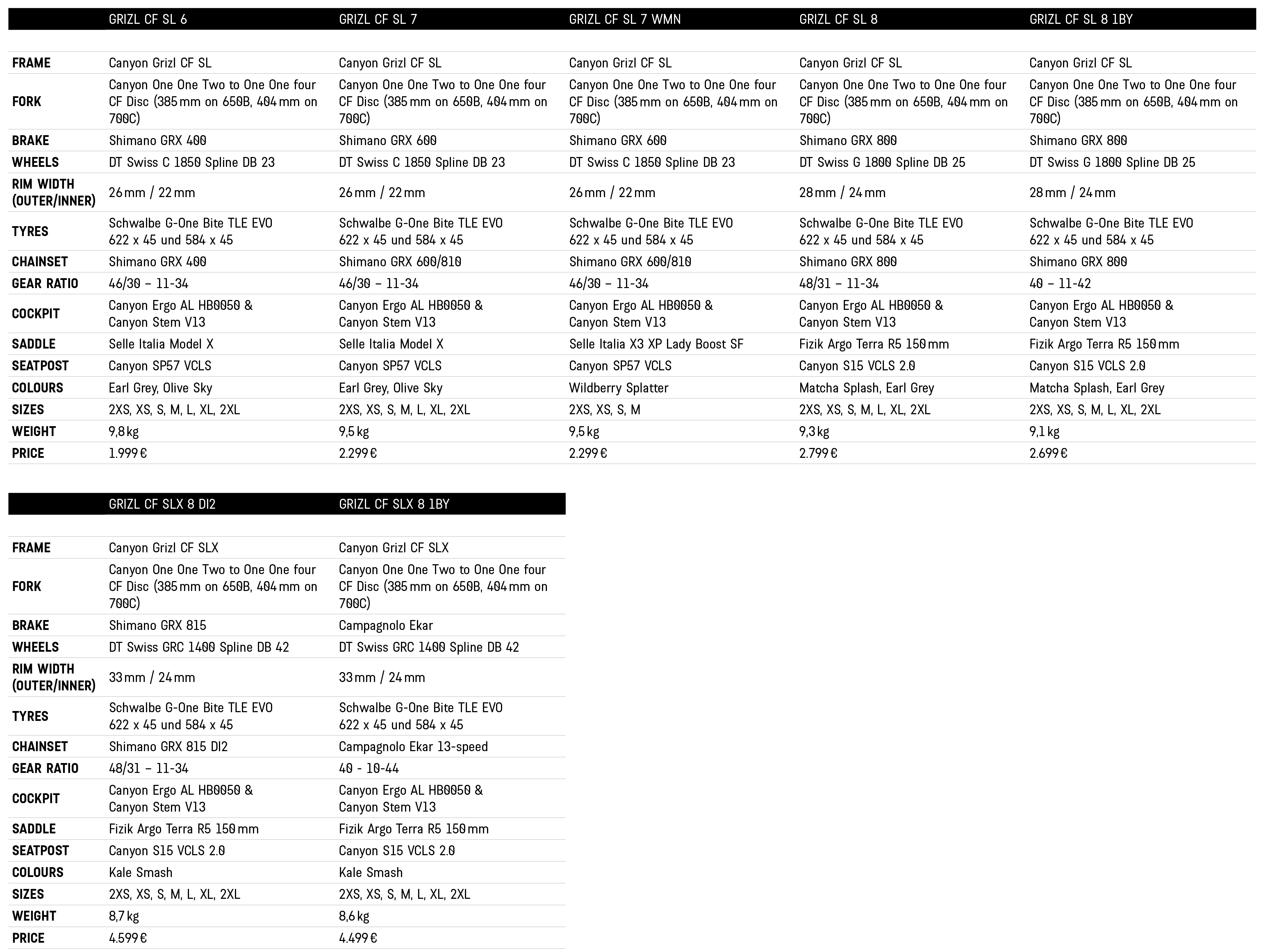 De nieuwe Grizl gravelbike is er alleen in het carbon, maar wél in twee smaken: SL en SLX, de twee typische benamingen voor een licht en nóg lichter carbon frame bij Canyon. Het SLX-frame zou 950 gram wegen, inclusief de lak en losse framedelen (zoals derailleurpat). Welke framemaat dit betreft, zegt Canyon niet. Ook vermeldt Canyon in het persbericht niet wat het gewicht is van het SL-frame, maar verwacht dat dit gemiddeld zo’n 200-250 gram méér zal zijn dan dat van de SLX.