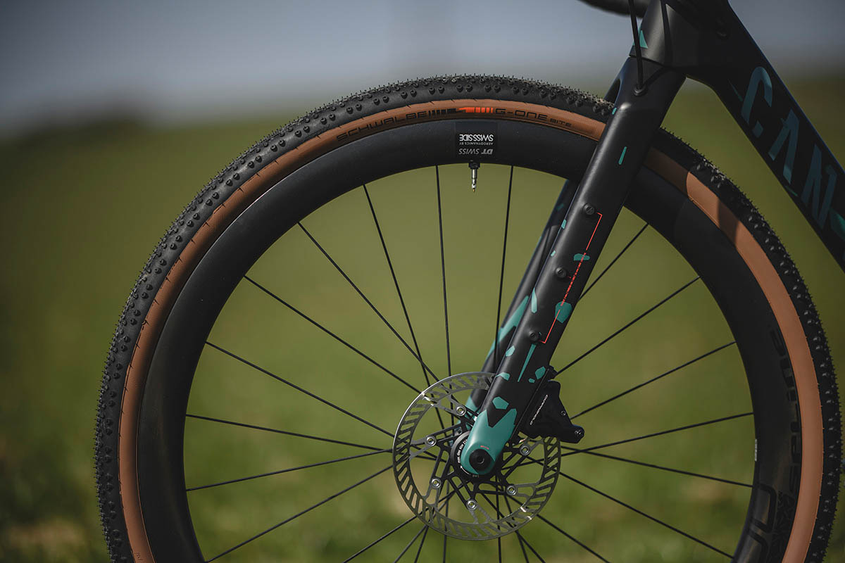 Bij de ontwikkeling van de Grizl gravelbike is het uitgangspunt van Canyon dan ook geweest om alles te maximaliseren. Dat betekent onder de streep dat de Grizl bewust ontwikkeld is voor één wielmaat. Nou ja, soort-van, althans. Want van de 7 (!) verkrijgbare framematen rollen de 2XS en XS standaard op 650b-wielen, de rest op 700c. Wat in elk geval voor alle framematen op gaat is dat je deze diameter(s) combineert met banden van 45 tot 50 mm. In combinatie met 45 mm banden kun je overigens ook nog steeds spatborden monteren.