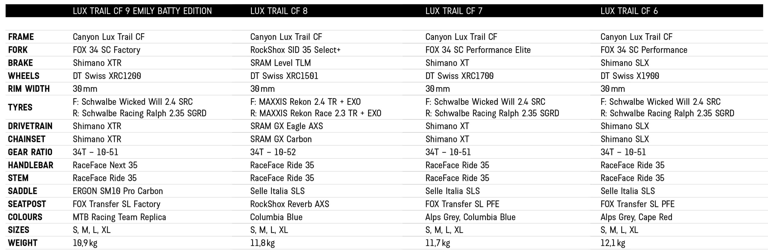 Canyon levert de Lux Trail-modellen in vier versies. Naast Fox 34 en RockShox Sid 35 voorvorken vind je op Lux Trail-modellen ook velgen met een binnenbreedte van 30 mm met 2.3-2.4 Inch breed rubber. Verder zijn ze afgemonteerd met bredere sturen, korte stuurpennen dan die je vind op de Lux CF en Lux CF SLX-modellen. En uiteraard kan een dropperzadelpen niet ontbreken.