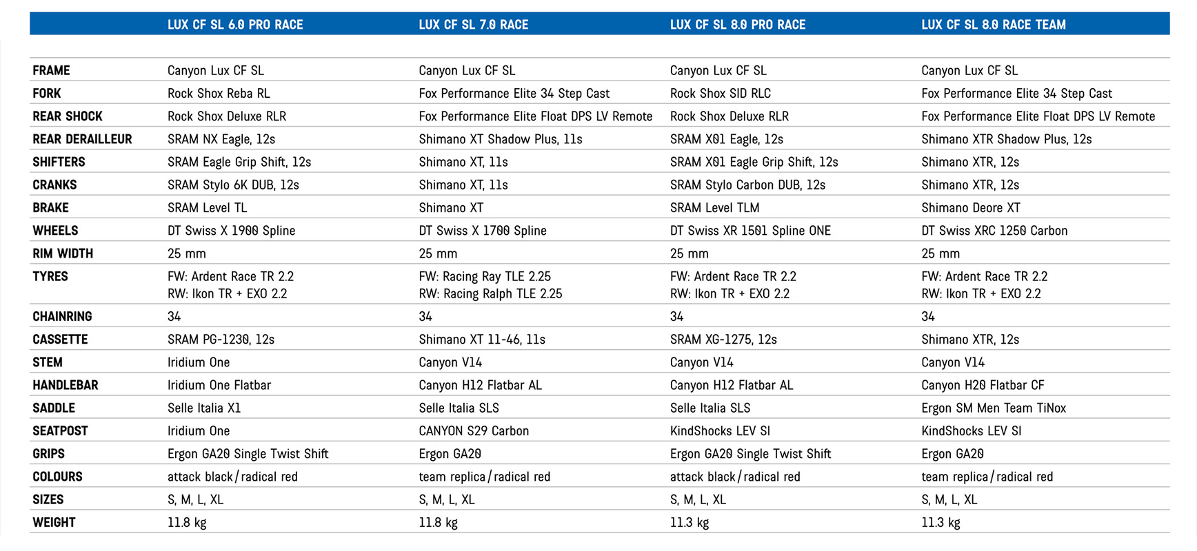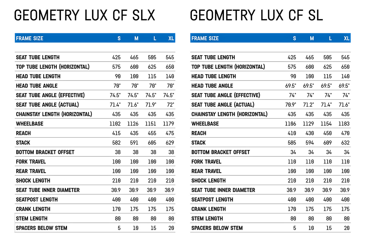 De nieuwe Lux wordt geleverd in 6 uitvoeringen. 2 voorzien van het lichtste SLX frame, 4 met het SL frame en vooraan 10 mm meer veerweg. Prijzen beginnen bij €2.599. Het topmodel voorzien van Shimano’s nieuwe XTR en kost €5.999. Een los Lux CF SLX frame is er voor €2.499.