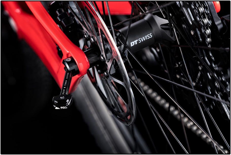 Verder is het frame alleen geschikt voor one-by aandrijfsystemen en schijnt Shimano Di2 (nog) niet te passen. Framedetails die het vermelden waard zijn, zijn onder meer de mogelijkheid voor het monteren van een dropper zadelpen met de kabel door het frame. Ook de bekabeling voor de remote van de achterdemper loopt binnendoor en is strak weggewerkt rond het montagepunt van de demper onder de bovenbuis. Op het hoofdscharnierpunt van de liggende vork nabij de trapas is een kleine kettinggeleider toegevoegd, mocht je niet voldoende vertrouwen op alleen de huidige generatie kettingbladen met dikke en dunne tanden én een clutch in de achterderailleur. Naast de typische Impact Protector Unit die doorslaan van de voorvork voorkomt en daarmee je frame beschermt, is het achterwiel vastgezet met een Canyon-eigen steekas-snelspanner. De hendel om de as te monteren of los te halen, klap je weg ín de steekas, wanneer je eenmaal op pad bent.