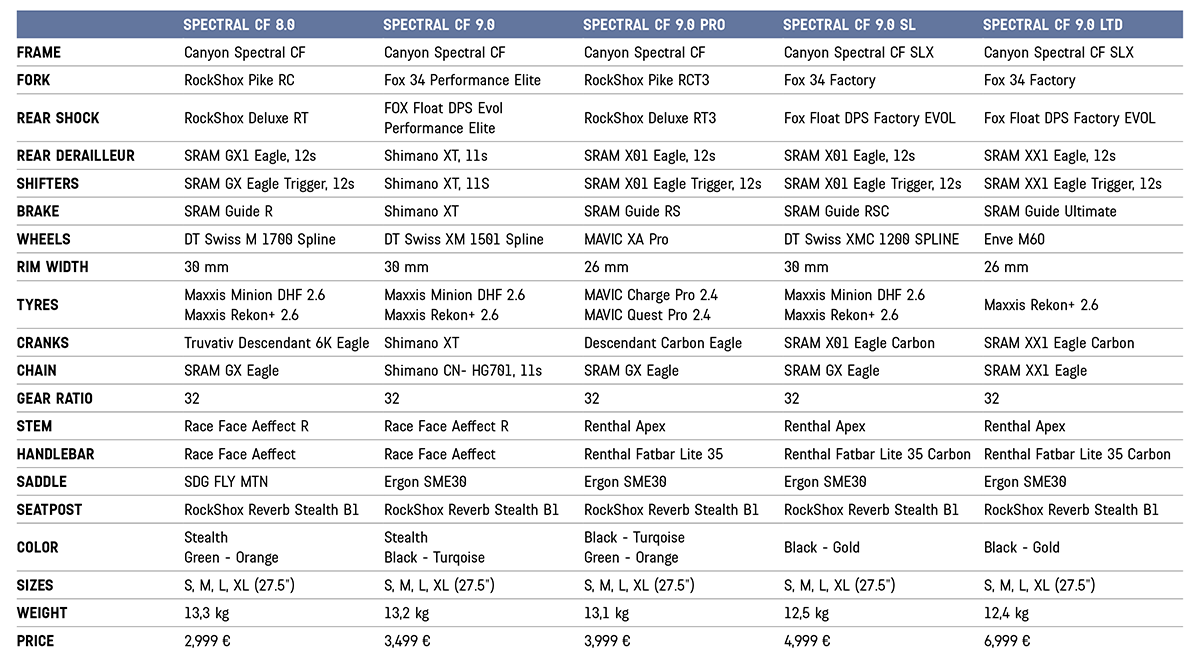 De Spectral zal er in 8 afmontage varianten zijn, waarbij er 3 verschillende framematerialen worden gebruikt. De range begint met de AL5.0 met een prijs van €2.199. “AL” staat natuurlijk voor aluminium. Zowel het voorframe als de achtervork zijn hierbij gemaakt met 6066 aluminium. De aluminium-reeks bestaat 3 modellen. Daarnaast komen 3 CF modellen die eveneens een aluminium achtervork hebben, maar een carbon voorframe. De Spectral serie wordt afgetopt met twee full-carbon modellen, de CF 9.0 SL en CF 9.0 LTD met een prijs van respectievelijk €4.999 en €6.999. Deze twee modellen zijn voorzien van het CF SLX frame waarbij voorframe én achtervork volledig uit carbon zijn.