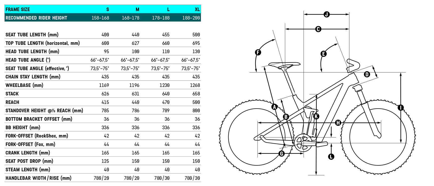 De vernieuwde Strive komt in 4 framematen. Qua stuurhoek hoefde het voor de Canyon-ontwikkelaars niet nóg langer & luier, 66 graden in de ‘vlakste’ stand bij het afdalen, vonden ze genoeg. De wielbasis is bij elk model ook redelijk ‘normaal’ voor hedendaagse begrippen.