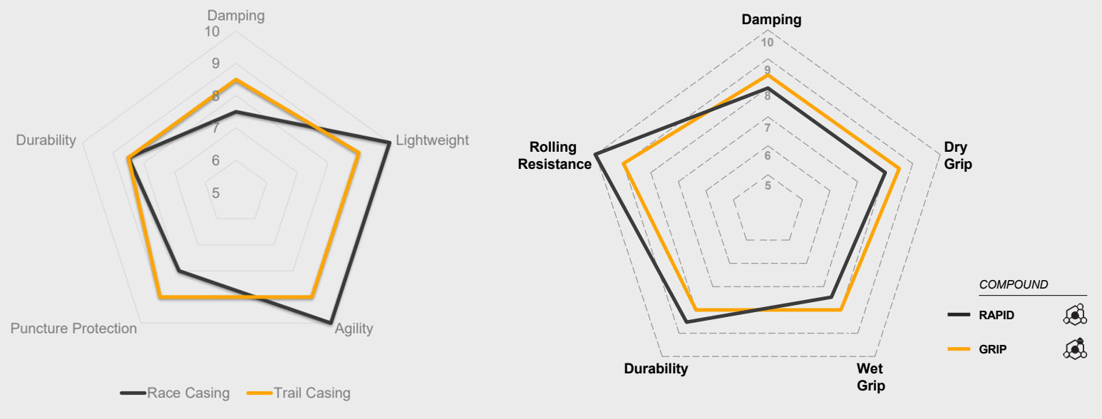 Het Race-karkas is de lichtste en soepelste versie en daarmee ook de snelste, aldus Conti. Dit karkas wordt dan ook gecombineerd met de Rapid-rubbersamenstelling (what’s in a name…). Het Trail-karkas is juist robuuster en biedt meer lekbescherming. Bij deze versie past Conti z’n Grip-rubbersamenstelling toe.