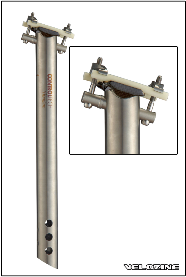 De TiMania familie wordt afgerond met een titanium zadelpen. De pen is leverbaar met een diameter van 27,2 millimeter bij een lengte van 350 millimeter en daarnaast een variant met een doorsnede van 31,6 millimeter bij een lengte van 400 millimeter. De eerst genoemde weegt 190 gram, de tweede brengt 239 gram op de weegschaal. De buis is opgetrokken uit 3al/2.5v titanium en de overige hardware, waaronder de bouten, zijn van de 6al/4v legering. De brug waarop het zadel rust is echter van carbon gemaakt. Een dergelijke klemconstructie, waarbij de zadelrails versprongen van de ondersteuning (de carbon brug) ingeklemd worden door de bovenste klemplaten, heeft doorgaans niet onze persoonlijke voorkeur. De reden daarvoor is de ‘schaarwerking’ die kan optreden en waardoor de zadelrails als het ware doorgeknipt kunnen worden bij een te hoge voorspankracht en piekbelastingen. ControlTech lijkt dit ondervangen te hebben door de carbon brug aan de achterzijde nipt wat verder door te laten steken waardoor dit euvel niet meer op zou moeten treden.