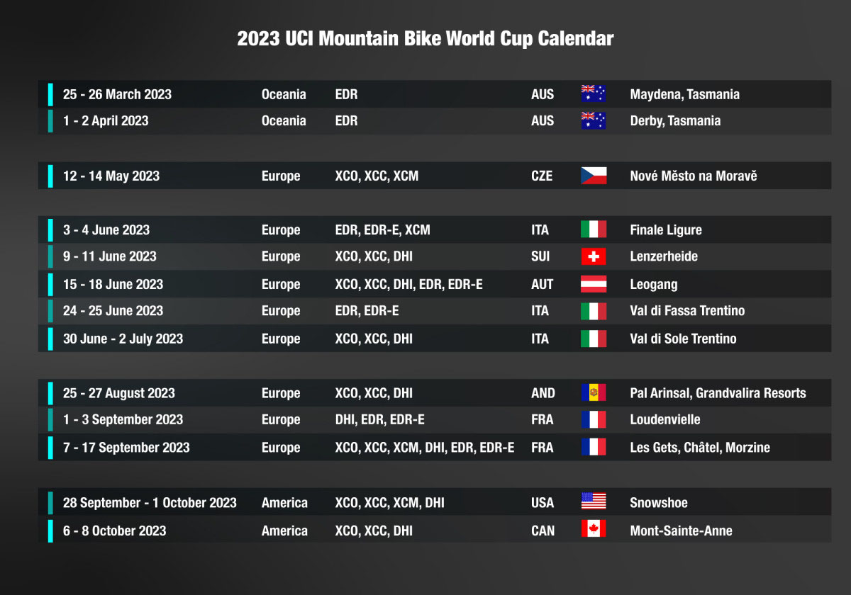 Tot dusver bestond de wereldbeker mountainbike uit een combinatie van crosscountry- (XCO) en downhillwedstrijden (DHI). Fourcross maakte er ook ooit deel van uit, maar het spektakelstuk werd geschrapt. Daarvoor kwam de crosscountry short track (XCC) voor de in de plaats. Vanaf 2023 zal de wereldbeker echter veel meer omvatten. Zo is de Enduro World Series (EWS) voortaan opgenomen in de wereldbeker. En het enduro-wedstrijdformat bestaat uit ‘reguliere’ endurowedstrijden (EDR) én endurowedstrijden met e-mountainbikes (EDR-E). Daarnaast is voortaan de crosscountrymarathon (XCM) óók een onderdeel van de wereldbeker mountainbike vanaf 2023.
