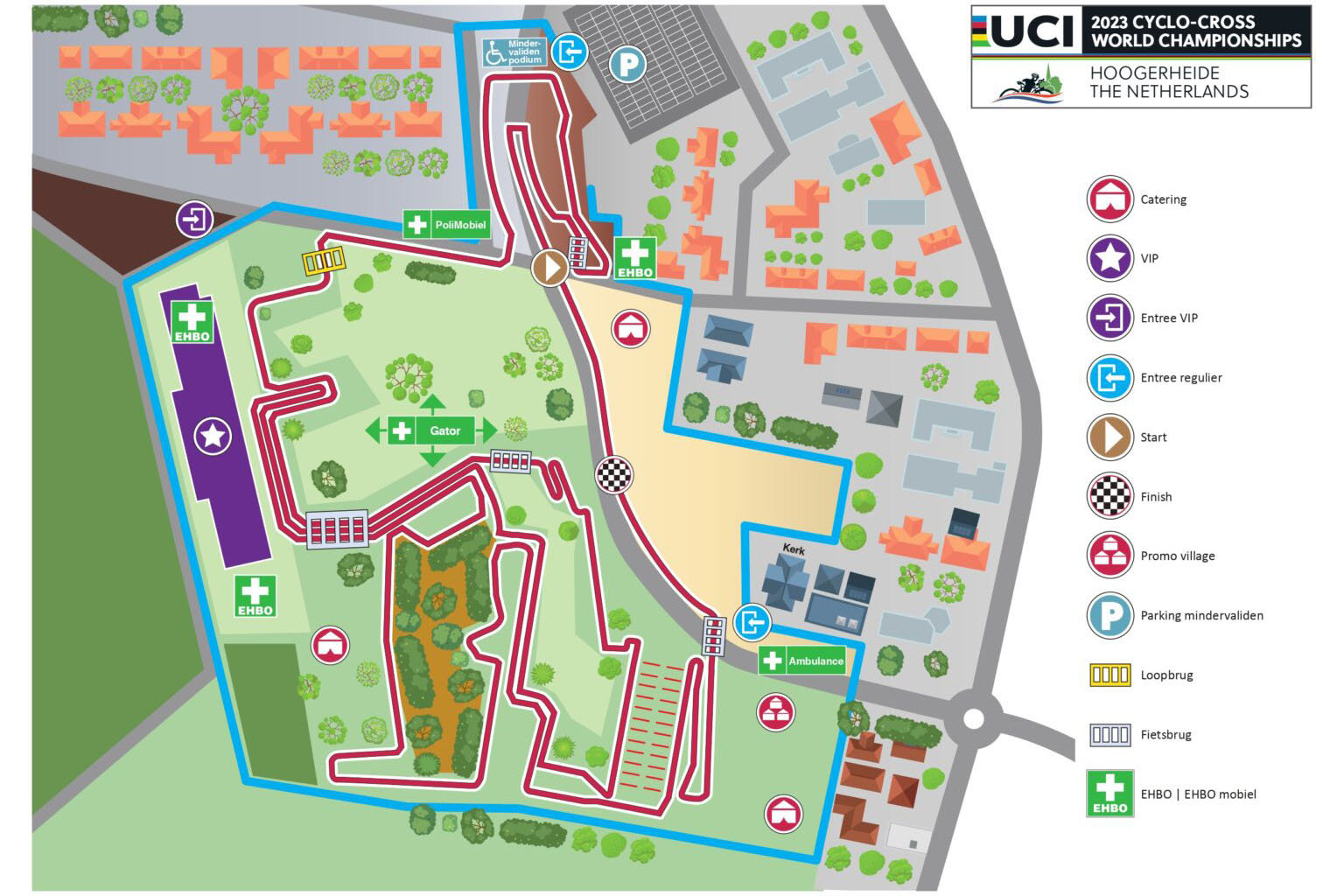 Al heel wat jaren worden er cyclocrosswedstrijden verreden in Hoogerheide. In vrijwel alle gevallen is het dan een snelle cross; het parcours ligt – voor het grootste deel – óók bij veel regenval er veelal goed rijdbaar bij. Het parcours voor het WK Veldrijden 2023 – mede uitgezet door Adrie van der Poel – ontbreekt het volledig aan oversteekplaatsen voor het publiek. Althans, het publiek loopt nergens dwars óver het parcours. Wel is er één voetgangersbrug.