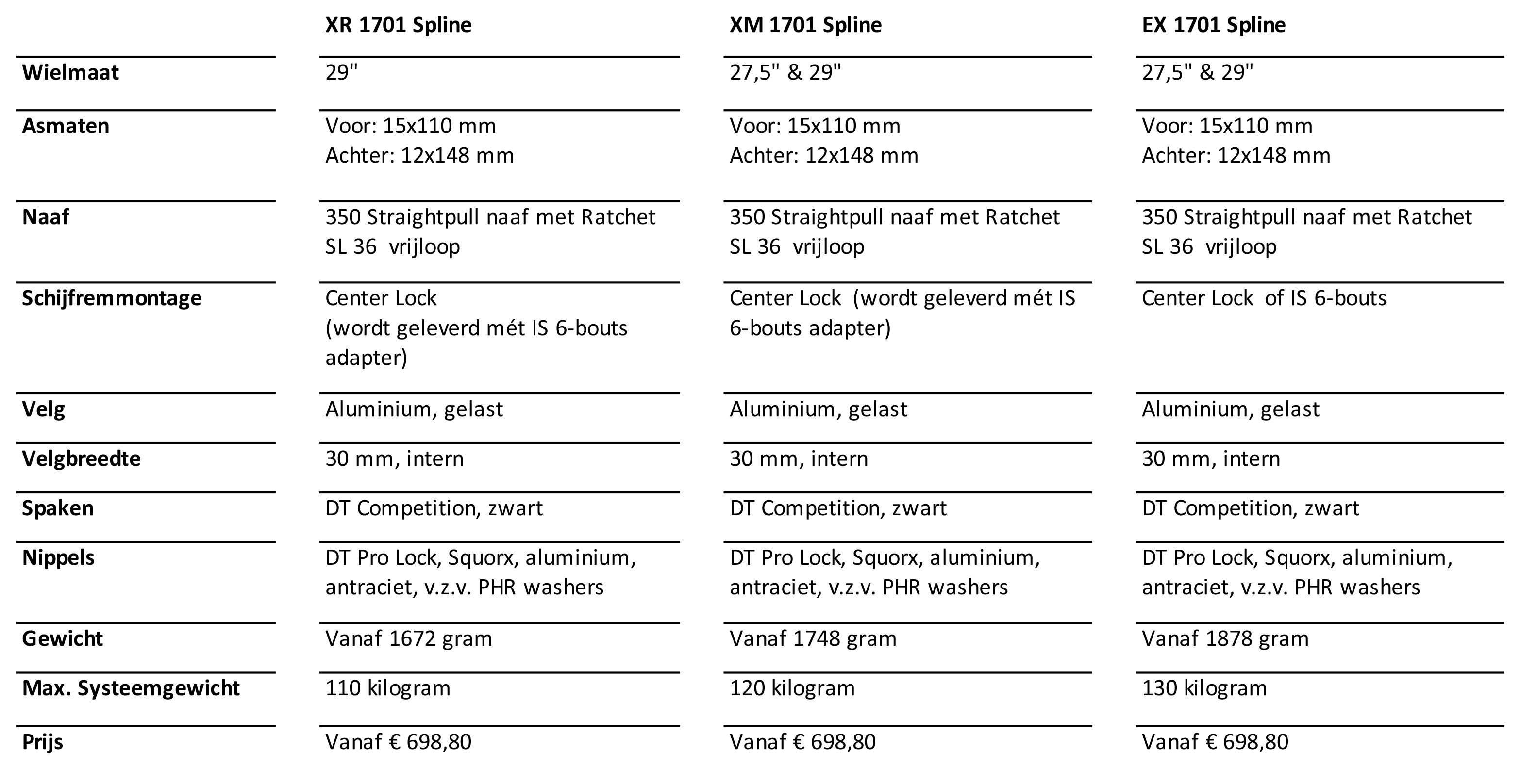 Gebaseerd op consumenten feedback heeft DT Swiss de serie ook verder aangescherpt. Waar er voorheen een veelvoud aan velgbreedtes beschikbaar was, hebben ze nu vooral gekeken naar wat consumenten kiezen wanneer ze losse velgen bij DT Swiss kochten. Om die reden is de nieuwe XR1700 voor cross country er alleen met de XR391 velg met een interne breedte van 25 mm. De XM1700 krijgt de XM481 velg met een interne breedte van 30 mm. De EX1700, tot slot, is opgebouwd met de EX511 velg die intern eveneens 30 mm breed is.