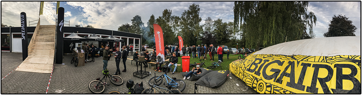 Ook werd er deze dag gefietst op de aangrenzende route van Zeddam. Met Specialized als gastheer zat niemand verlegen om fatsoenlijk materiaal. Voor hen die dan nog niet waren uitgespeeld had Velosolutions een pumptrack aangelegd én kon je van het dak van Specialized kantoor afrijden en het luchtruim kiezen op een flinke schans, om vervolgens te landen in een big airbag.