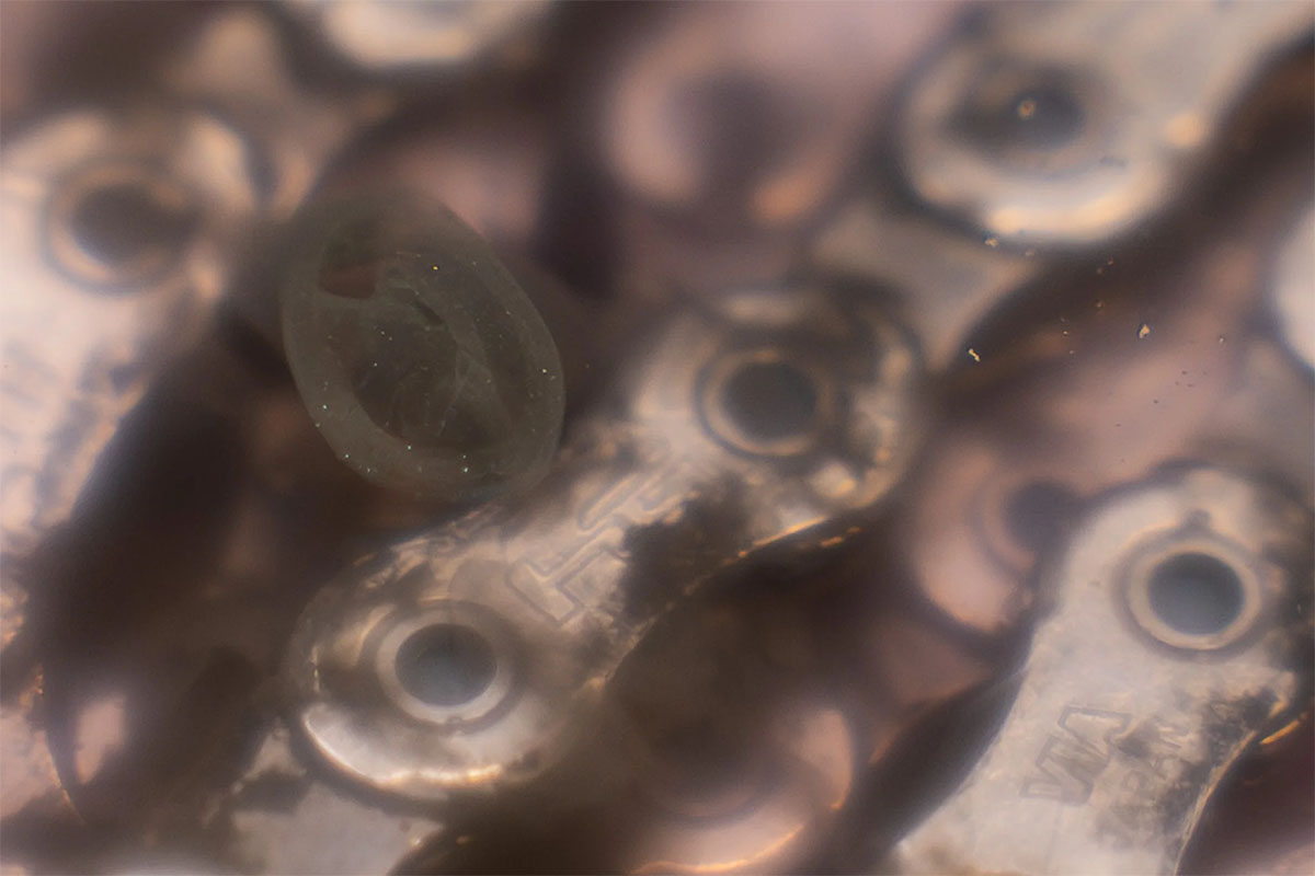 Deze compacte ultrasoonreiniger werkt met een frequentie van 40 kHz en verwarmt tot 80 graden Celsius. Het werkingsprincipe van een ultrasoonreiniger bestaat uit het principe dat er bij die frequentie continu piepkleine luchtbelltjes ontstaan die meteen imploderen. Dit proces heet cavitatie en de imploderende luchtbelletjes werken als een soort minuscule borsteltjes die vuil en vet loswrikken. En dat dus ook diep tussen de schakels en pinnen van de ketting. De plekken waar je met geen borstel terecht kunt. Dit proces werkt in principe zelfs met gewoon water, maar een specifiek schoonmaakmiddel (dat niet vluchtig is) versterkt het proces. Het resultaat is een ketting die écht metallisch schoon is, klaar voor een goede hechting van nieuwe kettingwas.