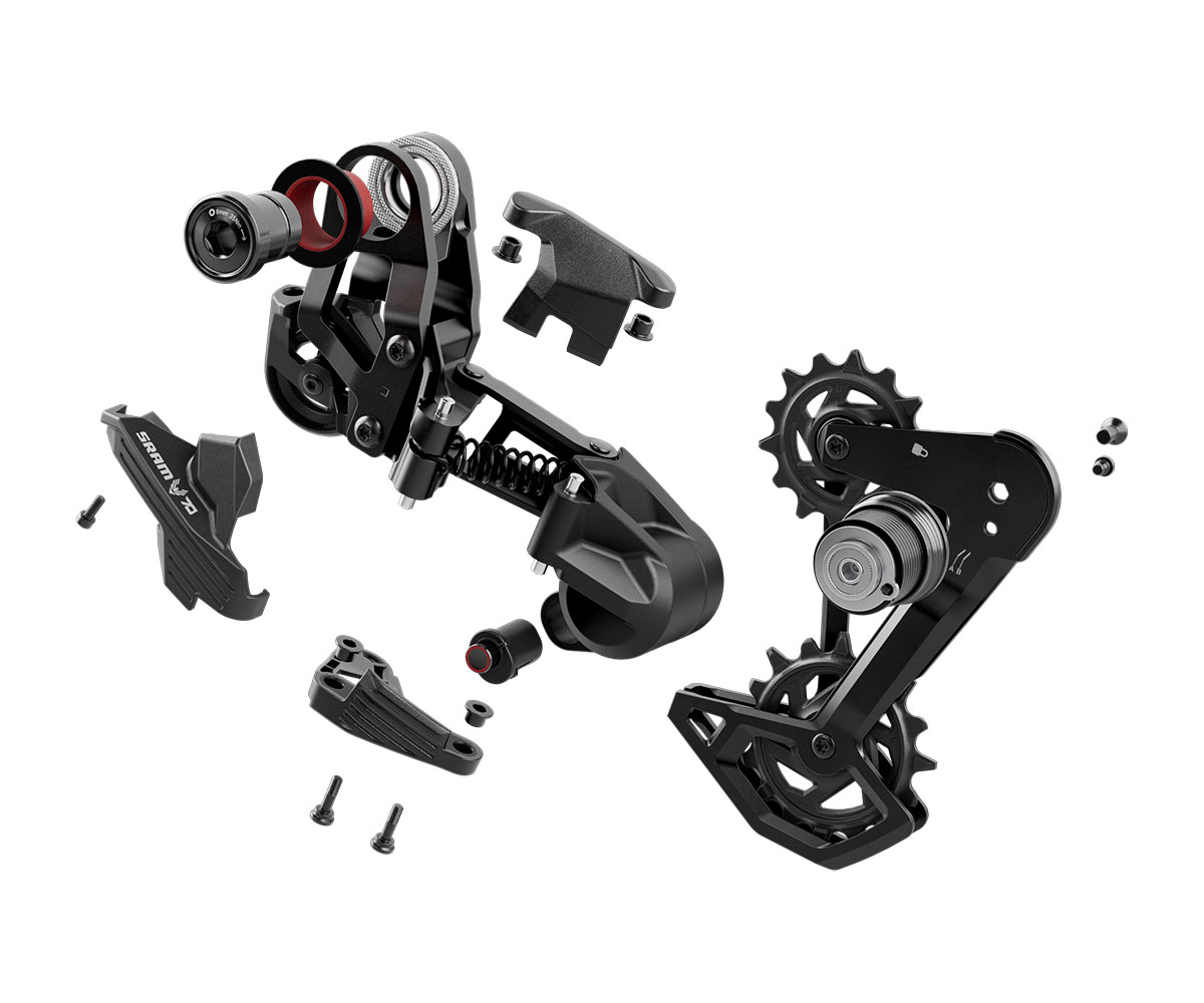De topgroep van de nieuwe mechanische Transmission-groepen is de Eagle 90 Transmission. Daarbij is de full-mount-derailleur verregaand te repareren met losse onderdelen, mocht je hem onverhoopt bij een valpartij hebben beschadigd. Verder past Sram bij deze derailleur z’n type 4-demper toe, zoals die gebruikt wordt bij de GX, X0 en XX Transmission-derailleurs. De Eagle 70 Transmission-derailleur maakt op zijn beurt gebruik van een sleepveer-demper. Een constructie die we onder meer kennen van de Apex en Rival AXS gravelbike-derailleurs.