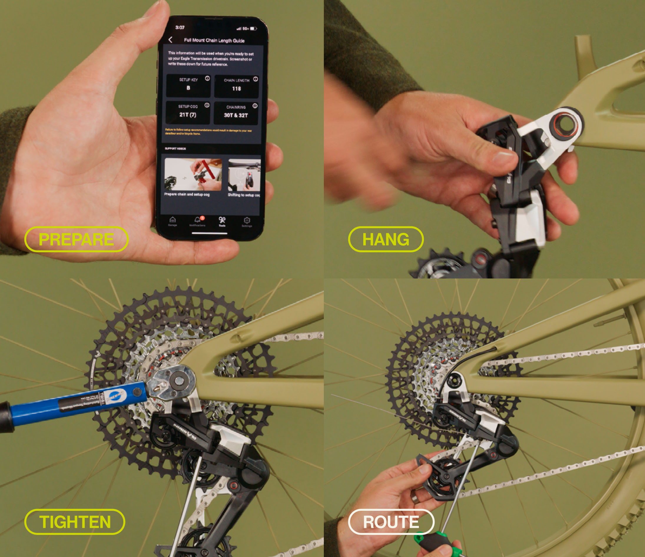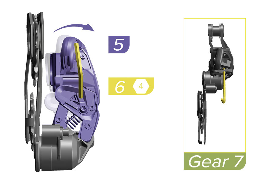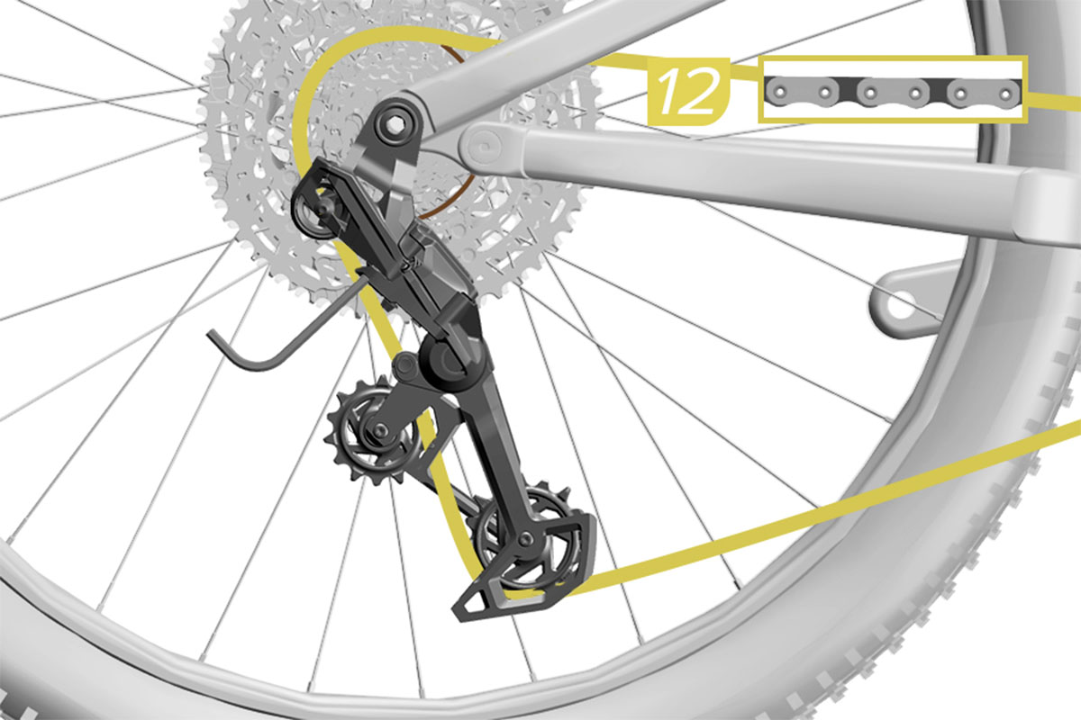 Kenmerkend voor de Transmission-derailleur installatie is dat je hierbij de derailleur op de juiste manier instelt op basis van een vooraf bepaalde kettinglengte en met de derailleur uitgelijnd onder de zesde of zevende versnelling, afhankelijk van je frame. Dit is bij de elektronische Transmission-derailleurs eenvoudig; die schakel je simpelweg maar die betreffende versnelling en blijft vervolgens staan. Bij de mechanische Eagle 70 en 90 Transmission-derailleurs heb je tot op dat punt de schakelkabel nog niet gemonteerd. Om toch de derailleur ten opzichte van de ‘set-up-versnelling’ uit te lijnen, heeft Sram een slim trucje toegepast. In de parallellogram is een gat aangebracht, waar je een 4 of 5 millimeter inbussleutel steekt, waarmee de derailleur dus op de juiste instelversnelling gezet wordt.