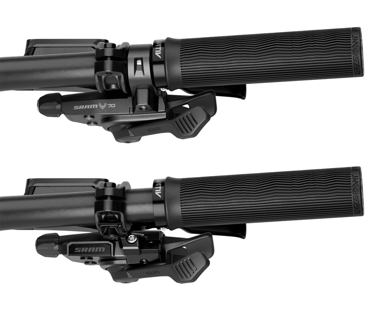 De behuizing van de schakelaar is ook groter, maar vervolgens nu parallel geplaatst aan het stuur. Ook de kabelloop is meer in lijn met het stuur. Dit noemt Sram de Stealth-kabelloop, waarbij geclaimd wordt dat door de krappere bocht naar het frame toe minder wrijving ontstaat in de kabel. Bij schakelaars waar de kabel schuiner van het stuur wegloopt, maak je in de regel een grotere, dus langere bocht en dat geeft volgens Sram méér wrijving.