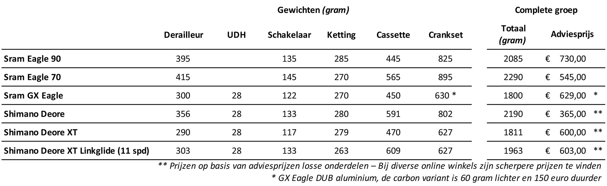 In onderstaande tabel hebben we Srams Eagle 70 en 90 Transmission vergeleken met de mechanische GX Eagle 12-speed groep. Ook hebben we de gewichten en prijzen van Shimano’s Deore M6100 en Deore XT M8100 mechanische 12-speed groepen er ter vergelijking bij gepakt. En om dat Sram met z’n Eagle 70 en 90 Transmission óók mikt op e-bikes, hebben we ook de e-bike-specifieke Deore XT Linkglide-onderdelen meegenomen. Merk daarbij op dat Shimano het bij die groep op 11 versnellingen houdt.