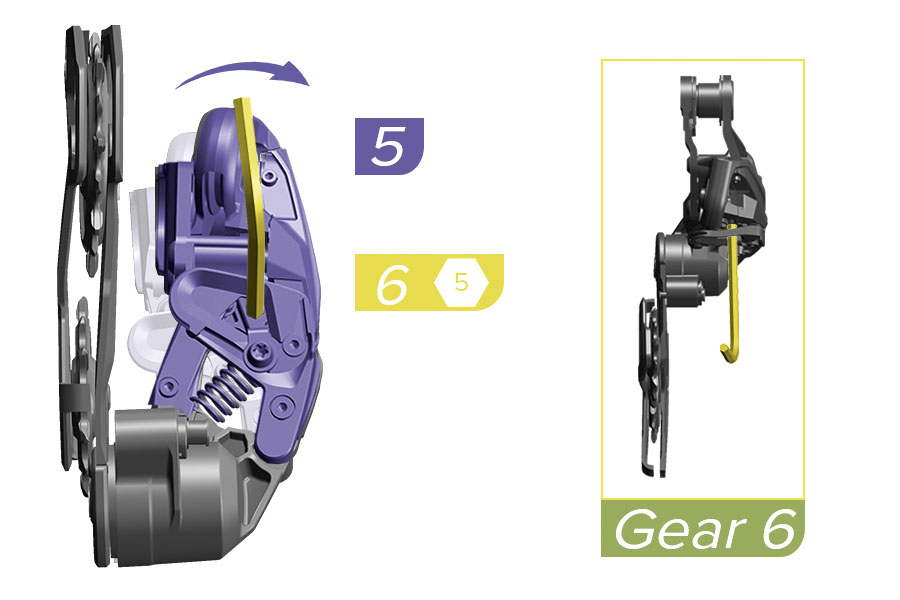 Je kunt maximaal maar twee kransen per keer groter schakelen, wanneer je de groep op een spierfiets zet. Dit is geheel te wijten aan de verregaande optimalisatie van de vertanding op de cassette. De ketting wil en – tot op zekere hoogte – kán uitsluitend schakelen in specifieke zones waar een goed ingrijpen in de volgende krans kan worden gegarandeerd. Wanneer je méér verplaatsing van de ketting zou willen realiseren gaat dit samenspel onherroepelijk mis. Sram borgt de schakelprestaties dus meer door je maar maximaal twee kransen groter te laten schakelen. Goed; het staat je vrij om alsnog twee keer twee schakelingen snel te doen. Schakelen naar een kleinere krans kan ook één krans per keer, zoals bij Sram altijd al het geval was.