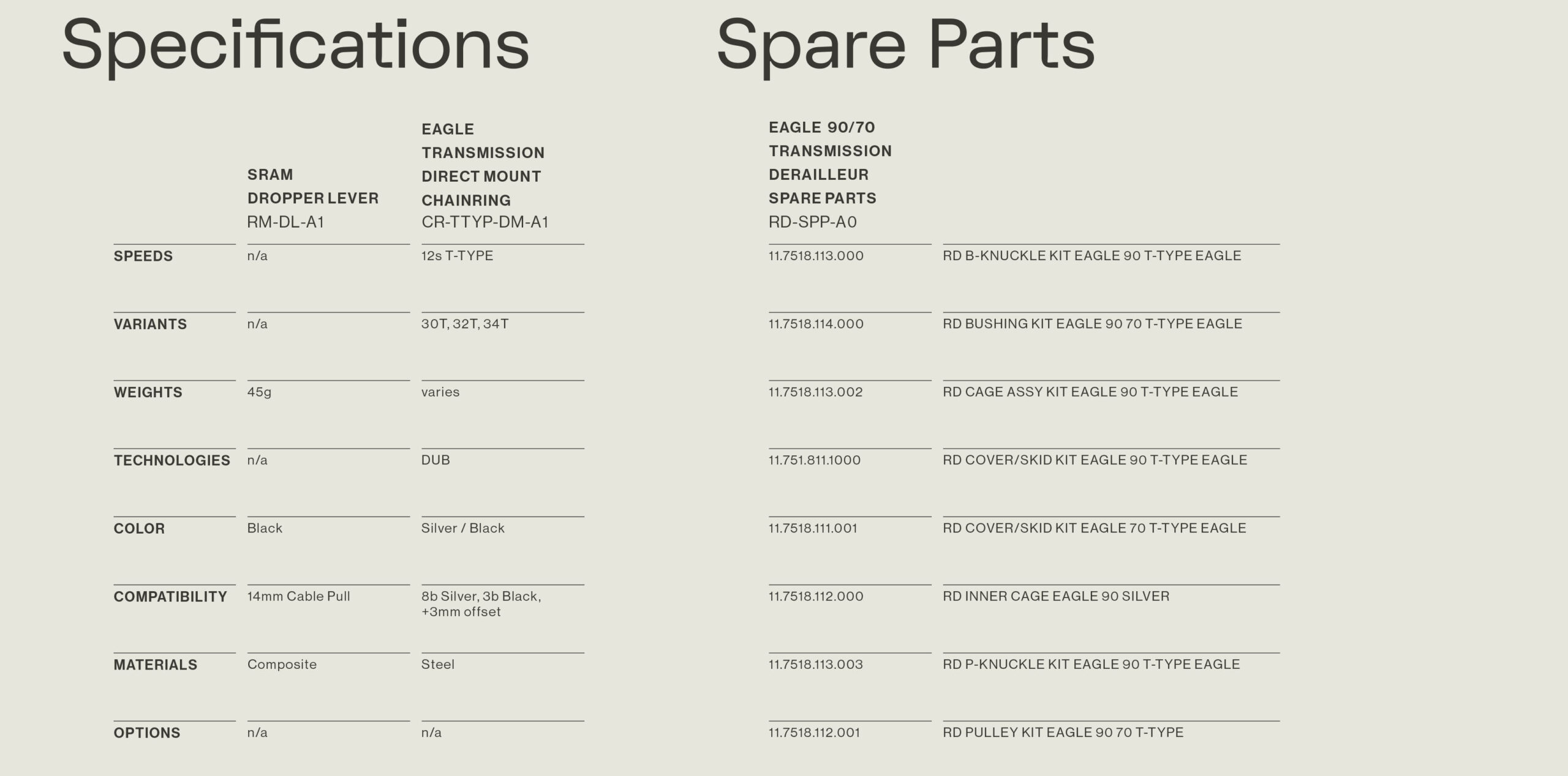 De mechanische Eagle derailleurs werken met alle 12-speed T-Type cassettes, kettingen en cranks. Sterker; tijdens de presentatie stelde Sram zich zelf voor dat gebruikers prima een Eagle 90 Transmission-derailleur kunnen combineren met bijvoorbeeld de lichtere aluminium of carbon cranks, cassette én van de X0 of XX (SL) Transmission-groep. De schakelaars werken alleen met deze mechanische Transmission-derailleurs en zijn dus niet compatibel met de vorige generatie mechanische Eagle-derailleurs.