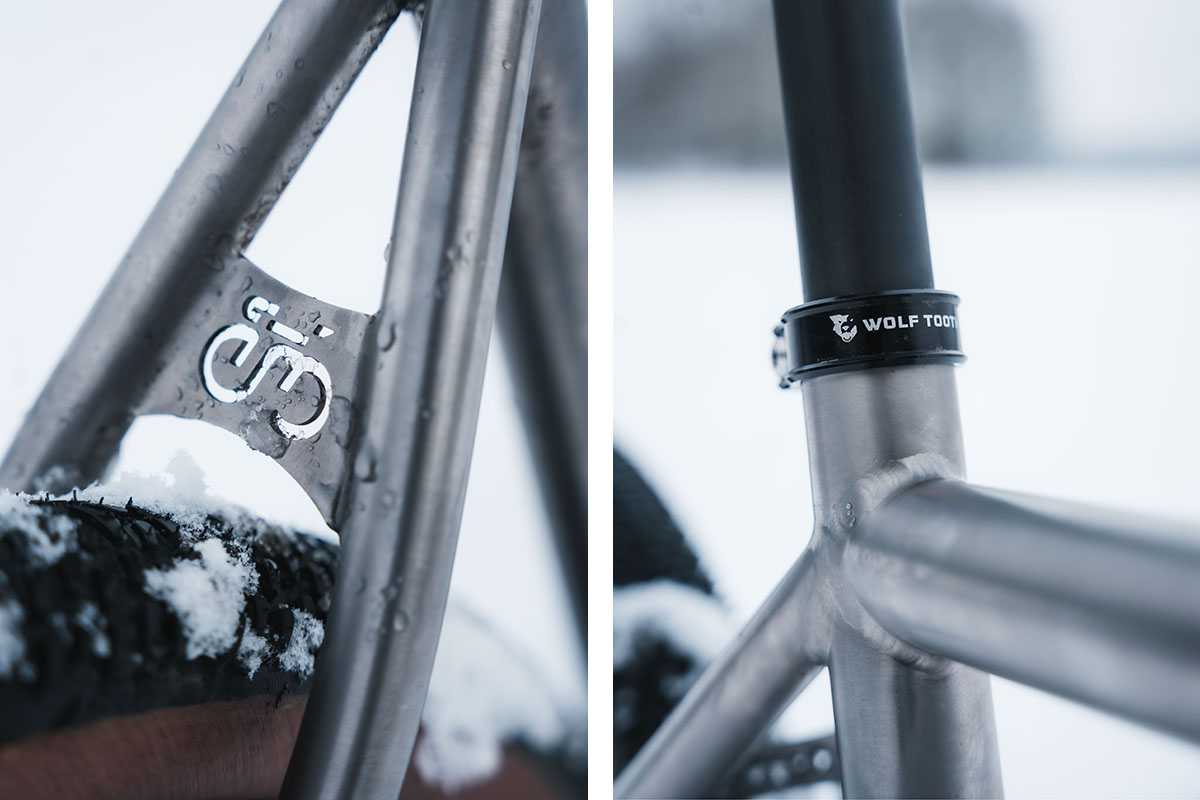 De Corsa Pévèle Ti heeft als all-roader een geometrie die afgeleid is van een racefiets, maar de trapas staat iets lager voor meer stabiliteit. Het frame en de voorvork bieden ruimte aan banden tot 40 millimeter breed wanneer je een aandrijving zónder voorderailleur monteert. Wil je vooraan met twee kettingbladen en voorderailleur rijden, dan kun je maximaal een band van 38 millimeter kwijt in de achtervork.