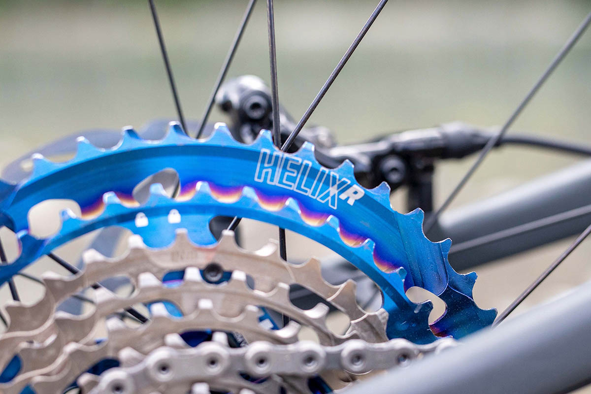 Ten opzichte van de bekende TRS+ cassettes met hetzelfde bereik, is het gewicht dus vooral het grootste nieuws. De nieuwe Helix R12 is namelijk 60 gram lichter. Bovendien kun je hem in meer ‘fancy’ kleuren krijgen. Had je voorheen bij e*thirteen alleen de keuze uit zwart, nu is het stalen deel van de cassette chrome-kleurig en kun je voor het aluminium deel met de 2 grootste kettingbladen kiezen uit (dark) ‘Grey’, ‘Naranja’, ‘Bronze’, ‘Eggplant’ en ‘Intergalactic’. Laatstgenoemde is een PVD-coating die veel sterker is dan een anodisatielaag en dus langer standhoudt.