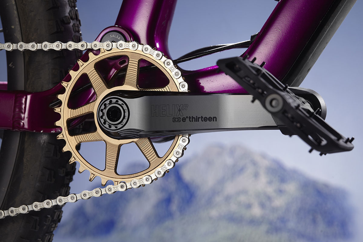 De Helix Race komt standaard met zelflossende crankbout voor gemakkelijke demontage om bijvoorbeeld een kettingblad te wisselen. En bij die kettingbladen heb je de keuze uit E*Thirteens Helix Race Direct Mount flipflop-kettingbladen. Flipflop? Ja, de offset van de bladen is dusdanig dat je door het omdraaien van een Boost naar een Superboost-kettinglijn gaat. Deze kettingbladen zijn overigens Sram en Shimano 12-speed compatibel en hebben uiteraard een dik-dunvertanding voor het beter vasthouden van de ketting.