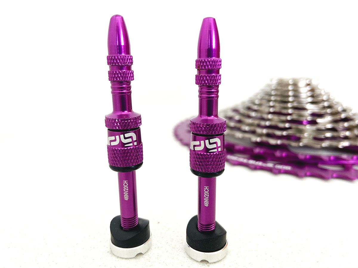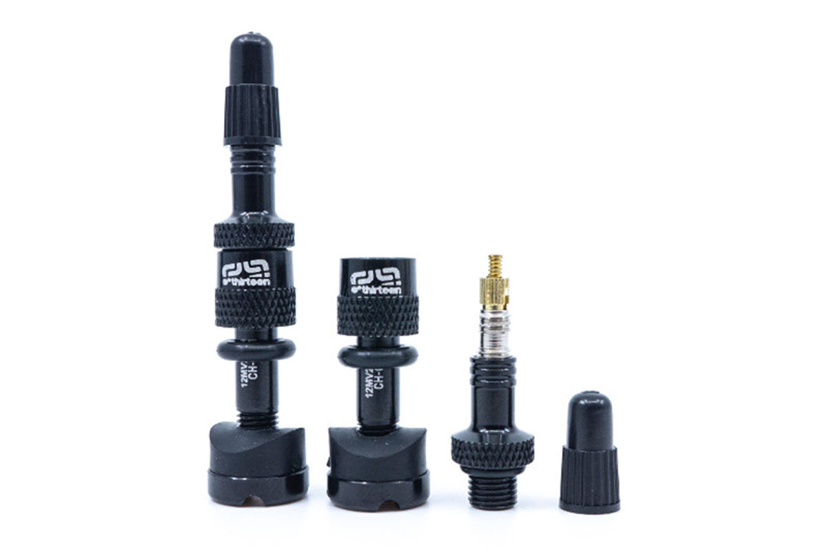 E*Thirteen levert de Quick Fill Plasma-tubelessventielen in twee lengtes. De kortste is geschikt voor montage in velgen met een hoogte van 16 tot 24 mm. De langere versie monteer je in velgen die 23 tot 31 mm hoog zijn. Het gewicht is 17 gram voor de kortste versie. De langere weegt één gram méér. Daarnaast heb je de keuze uit de kleuren black, bronze, eggplant, naranja en intergalactic. Een setje van twee ventielen kost je € 25,37, tenzij je de intergalactic-kleur wilt; dan betaal je € 5 méér.